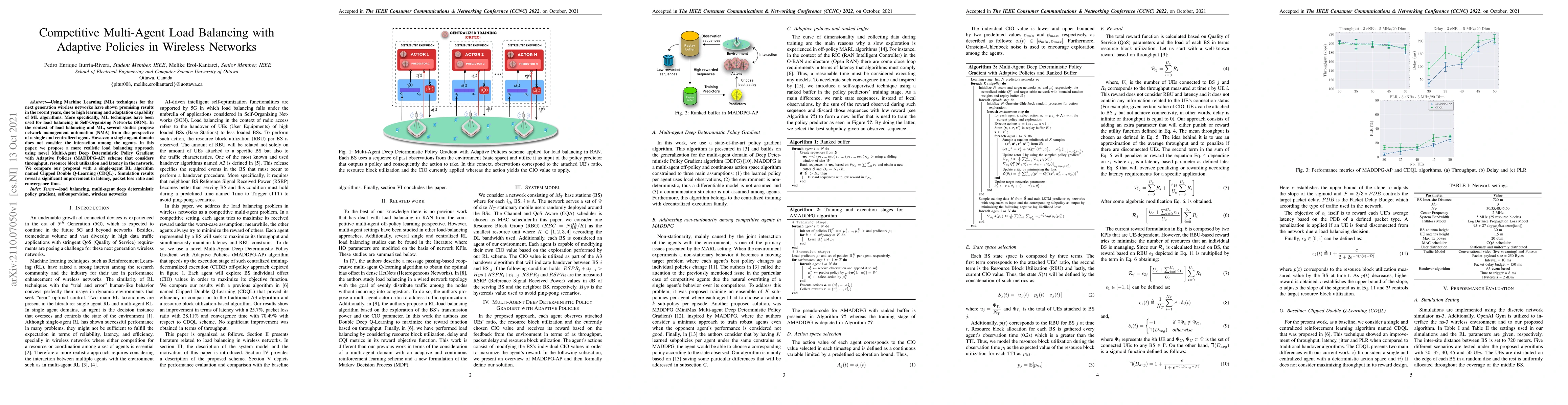 This paper proposes a Multi-Agent Deep Deterministic Policy Gradient with Adaptive Policies (MADDPG-AP) scheme for load balancing in wireless networks, considering throughput, resource block utilization, and latency. Simulation results show significant improvements over a single-agent Clipped Double Q-Learning (CDQL) approach in terms of latency, packet loss ratio, and convergence time.