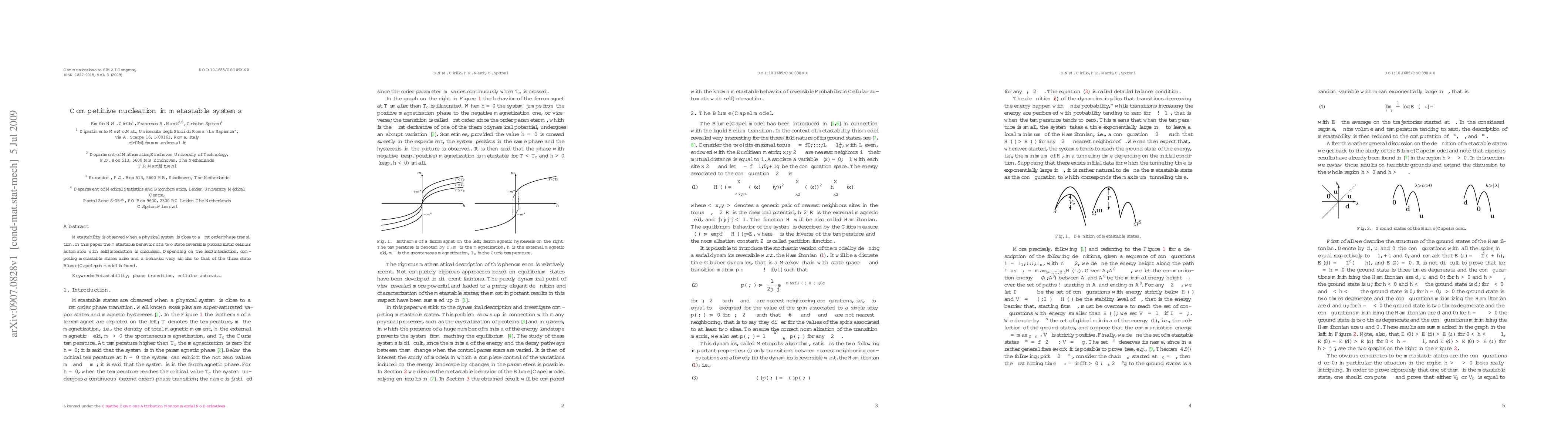 Metastability is observed when a physical system is close to a first order phase transition. In this paper the metastable behavior of a two state reversible probabilistic cellular automaton with self-interaction is discussed. Depending on the self-interaction, competing metastable states arise and a behavior very similar to that of the three state Blume-Capel spin model is found.