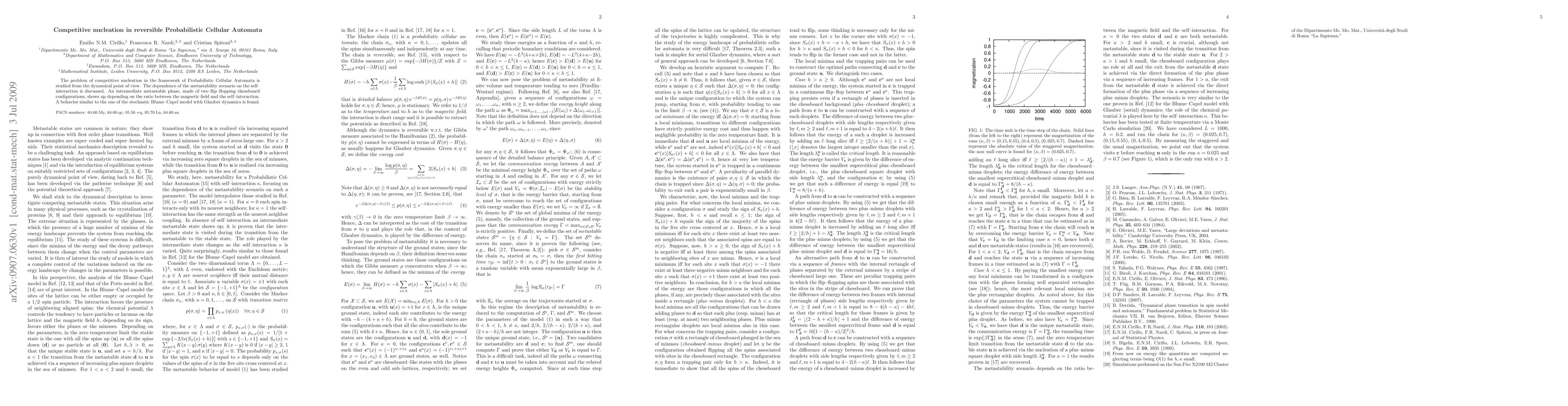 The problem of competitive nucleation in the framework of Probabilistic Cellular Automata is studied from the dynamical point of view. The dependence of the metastability scenario on the self--interaction is discussed. An intermediate metastable phase, made of two flip--flopping chessboard configurations, shows up depending on the ratio between the magnetic field and the self--interaction. A behavior similar to the one of the stochastic Blume--Capel model with Glauber dynamics is found.