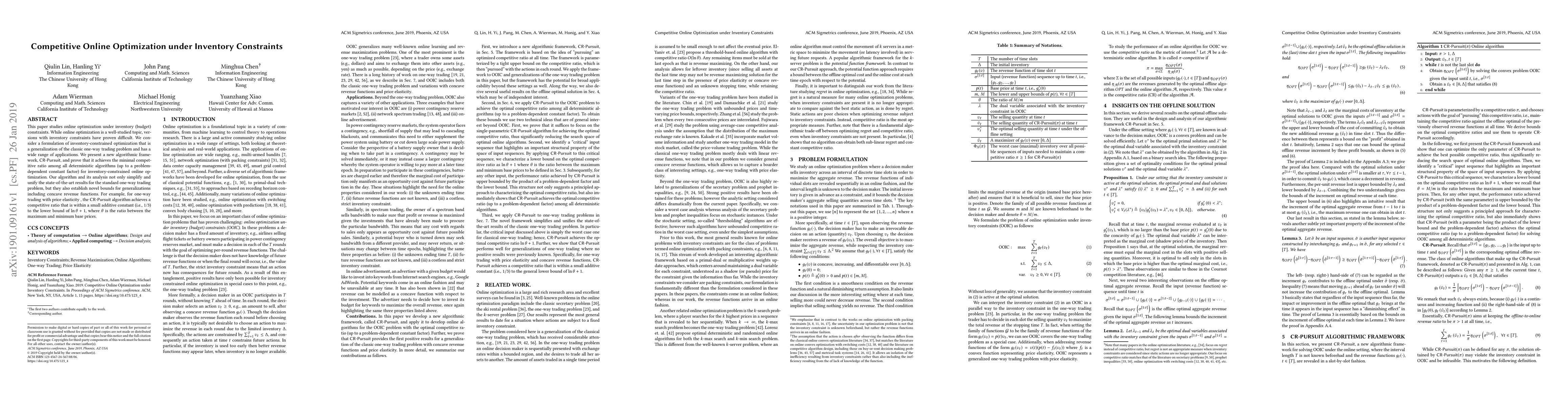 This paper introduces a new algorithmic framework, \textsf{CR-Pursuit}, for online optimization under inventory constraints, proving it achieves the best competitive ratio among deterministic algorithms. The framework generalizes the one-way trading problem and sets new bounds for scenarios including concave revenue functions.