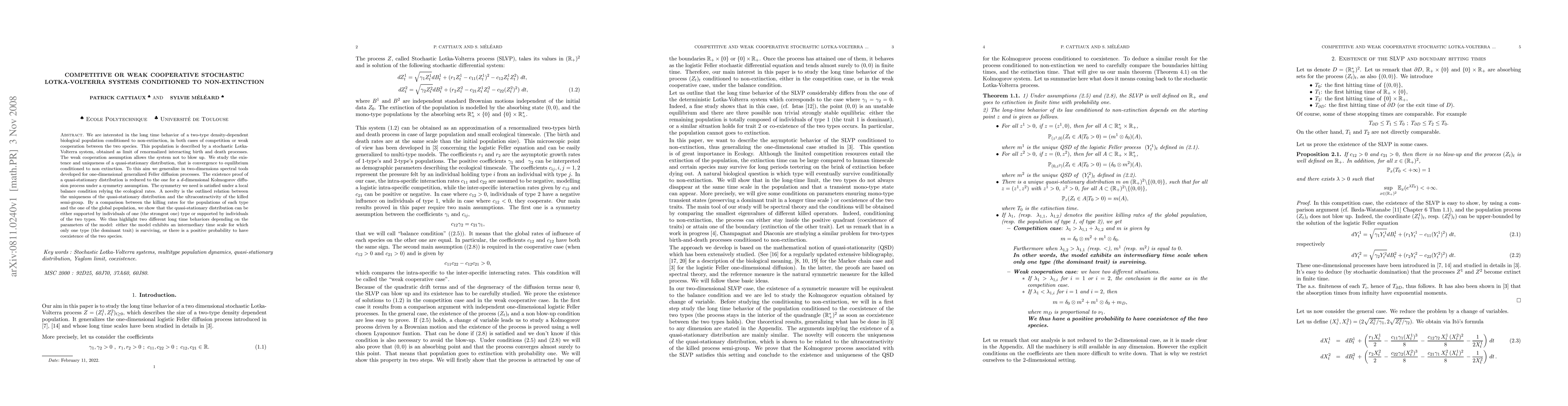 We are interested in the long time behavior of a two-type density-dependent biological population conditioned to non-extinction, in both cases of competition or weak cooperation between the two species. This population is described by a stochastic Lotka-Volterra system, obtained as limit of renormalized interacting birth and death processes. The weak cooperation assumption allows the system not to blow up. We study the existence and uniqueness of a quasi-stationary distribution, that is convergence to equilibrium conditioned to non extinction. To this aim we generalize in two-dimensions spectral tools developed for one-dimensional generalized Feller diffusion processes. The existence proof of a quasi-stationary distribution is reduced to the one for a $d$-dimensional Kolmogorov diffusion process under a symmetry assumption. The symmetry we need is satisfied under a local balance condition relying the ecological rates. A novelty is the outlined relation between the uniqueness of the quasi-stationary distribution and the ultracontractivity of the killed semi-group. By a comparison between the killing rates for the populations of each type and the one of the global population, we show that the quasi-stationary distribution can be either supported by individuals of one (the strongest one) type or supported by individuals of the two types. We thus highlight two different long time behaviors depending on the parameters of the model: either the model exhibits an intermediary time scale for which only one type (the dominant trait) is surviving, or there is a positive probability to have coexistence of the two species.