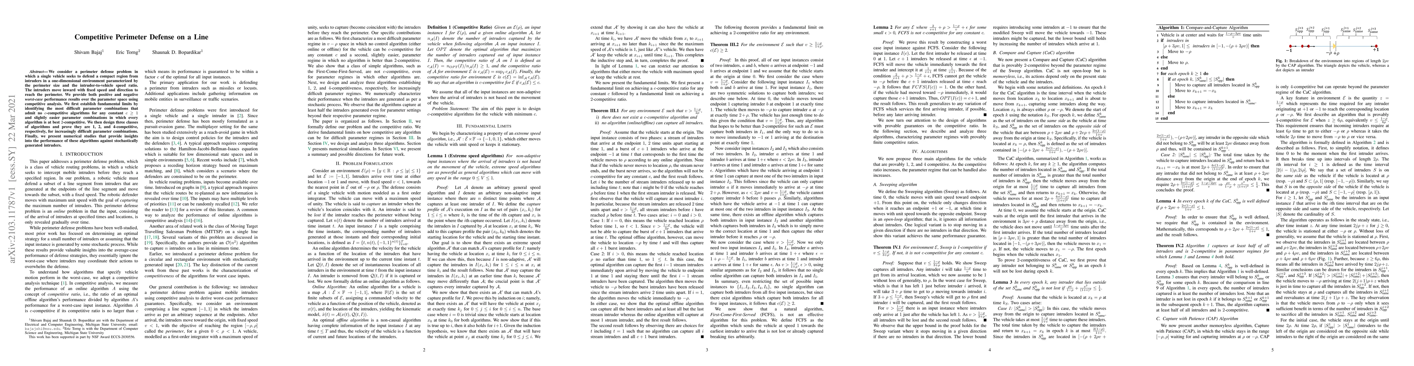 Researchers investigated a perimeter defense problem in one-dimensional space, finding fundamental limits and designing algorithms with competitive performance; the results show that 1-4 competitive algorithms exist for different parameter combinations.