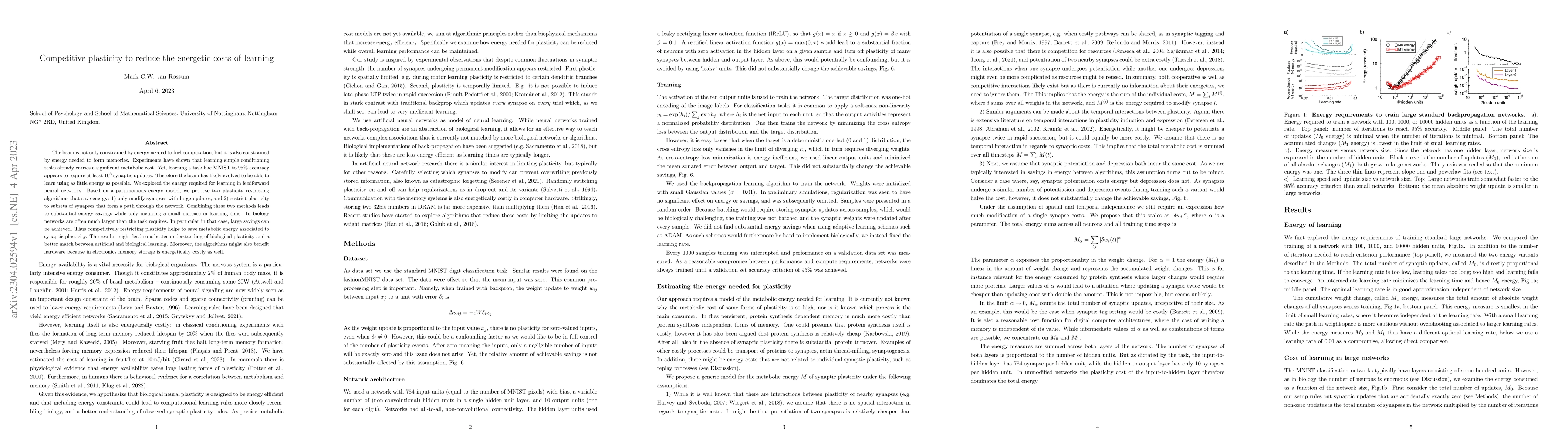 The brain is not only constrained by energy needed to fuel computation, but it is also constrained by energy needed to form memories. Experiments have shown that learning simple conditioning tasks already carries a significant metabolic cost. Yet, learning a task like MNIST to 95% accuracy appears to require at least 10^{8} synaptic updates. Therefore the brain has likely evolved to be able to learn using as little energy as possible. We explored the energy required for learning in feedforward neural networks. Based on a parsimonious energy model, we propose two plasticity restricting algorithms that save energy: 1) only modify synapses with large updates, and 2) restrict plasticity to subsets of synapses that form a path through the network. Combining these two methods leads to substantial energy savings while only incurring a small increase in learning time. In biology networks are often much larger than the task requires. In particular in that case, large savings can be achieved. Thus competitively restricting plasticity helps to save metabolic energy associated to synaptic plasticity. The results might lead to a better understanding of biological plasticity and a better match between artificial and biological learning. Moreover, the algorithms might also benefit hardware because in electronics memory storage is energetically costly as well.