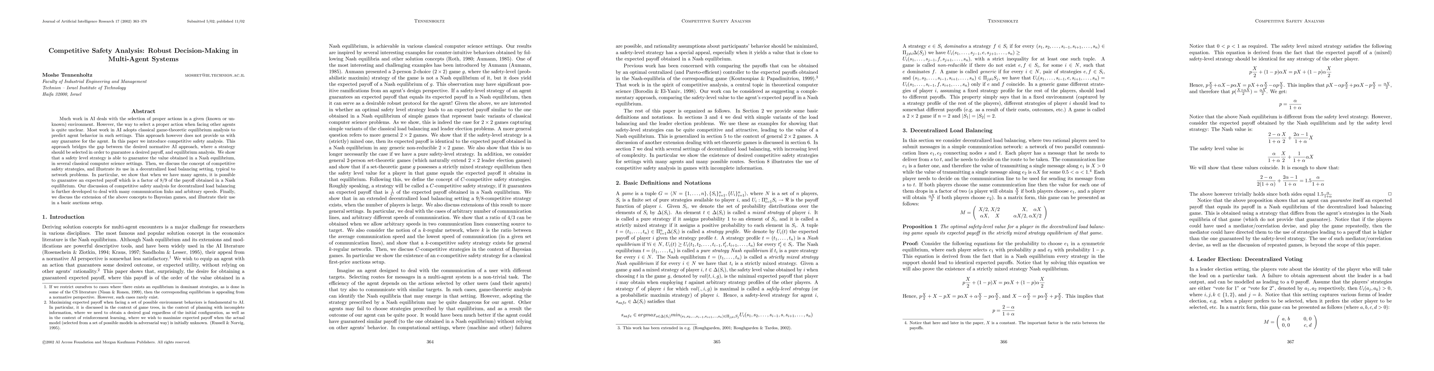 Much work in AI deals with the selection of proper actions in a given (known or unknown) environment. However, the way to select a proper action when facing other agents is quite unclear. Most work in AI adopts classical game-theoretic equilibrium analysis to predict agent behavior in such settings. This approach however does not provide us with any guarantee for the agent. In this paper we introduce competitive safety analysis. This approach bridges the gap between the desired normative AI approach, where a strategy should be selected in order to guarantee a desired payoff, and equilibrium analysis. We show that a safety level strategy is able to guarantee the value obtained in a Nash equilibrium, in several classical computer science settings. Then, we discuss the concept of competitive safety strategies, and illustrate its use in a decentralized load balancing setting, typical to network problems. In particular, we show that when we have many agents, it is possible to guarantee an expected payoff which is a factor of 8/9 of the payoff obtained in a Nash equilibrium. Our discussion of competitive safety analysis for decentralized load balancing is further developed to deal with many communication links and arbitrary speeds. Finally, we discuss the extension of the above concepts to Bayesian games, and illustrate their use in a basic auctions setup.