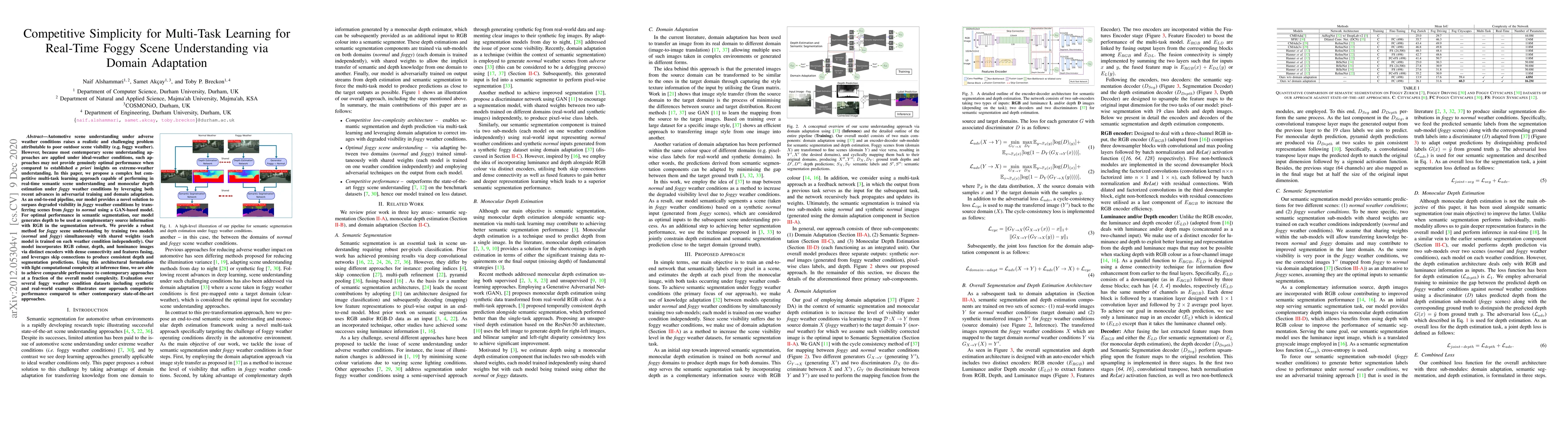 This paper proposes a real-time multi-task learning approach for semantic scene understanding and monocular depth estimation under foggy conditions, leveraging adversarial training and domain adaptation. The model uses a GAN-based method to transfer foggy scenes to normal conditions, combining RGB, depth, and luminance images for optimal performance.