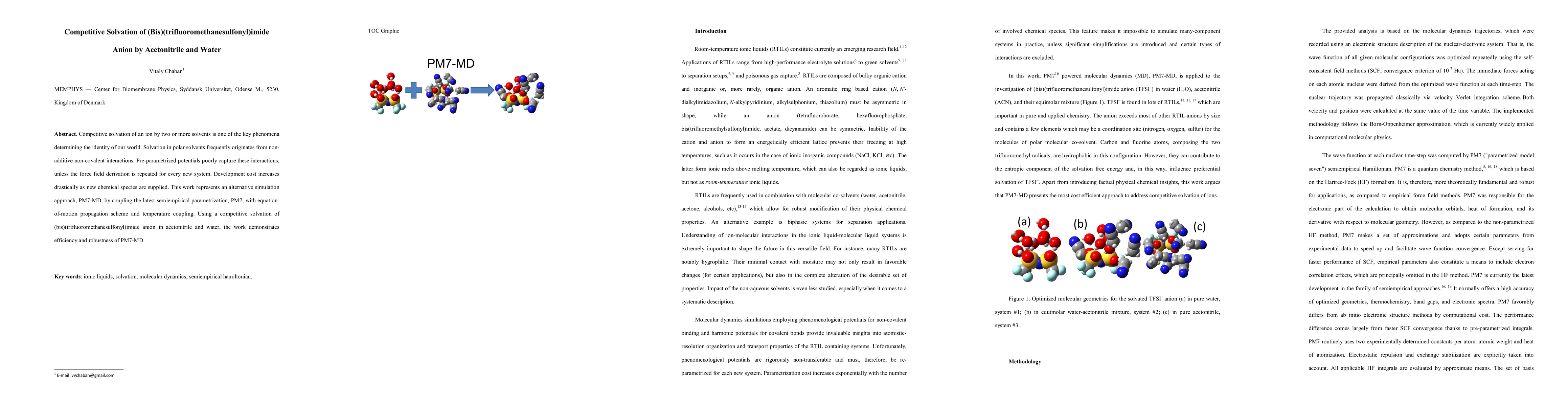 This paper explores the competitive solvation of the (bis)(trifluoromethanesulfonyl)imide anion by acetonitrile and water, highlighting the limitations of pre-parametrized potentials in capturing non-additive interactions. It introduces a novel PM7-MD simulation approach, combining PM7 parametrization with advanced computational techniques, to efficiently model such complex solvation phenomena.