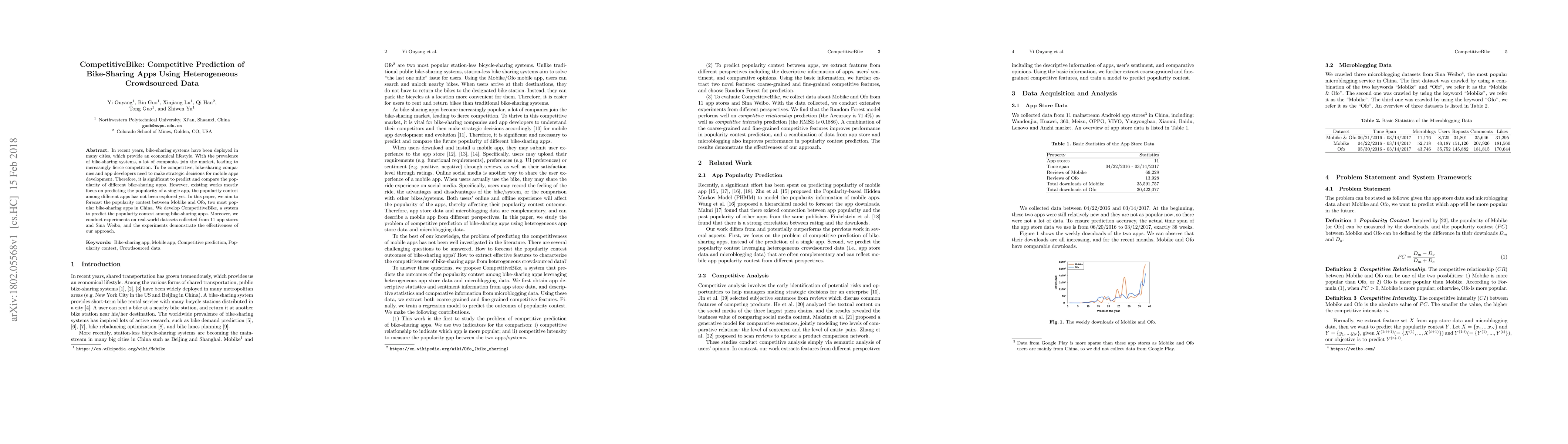 This paper introduces CompetitiveBike, a system designed to predict the popularity contest between bike-sharing apps, specifically Mobike and Ofo in China. The study leverages heterogeneous crowdsourced data and demonstrates its effectiveness through experiments on real-world datasets from app stores and social media.