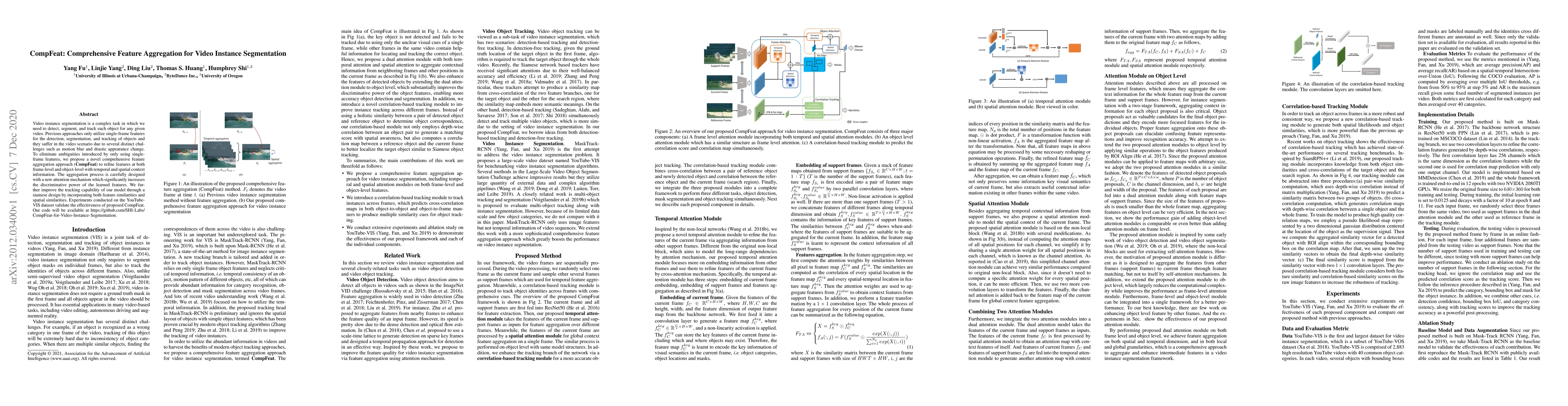 The paper introduces CompFeat, a comprehensive feature aggregation method for video instance segmentation that refines features using temporal and spatial context, enhancing discriminative power and tracking capability through a novel attention mechanism and siamese design. Experiments on YouTube-VIS demonstrate its effectiveness.