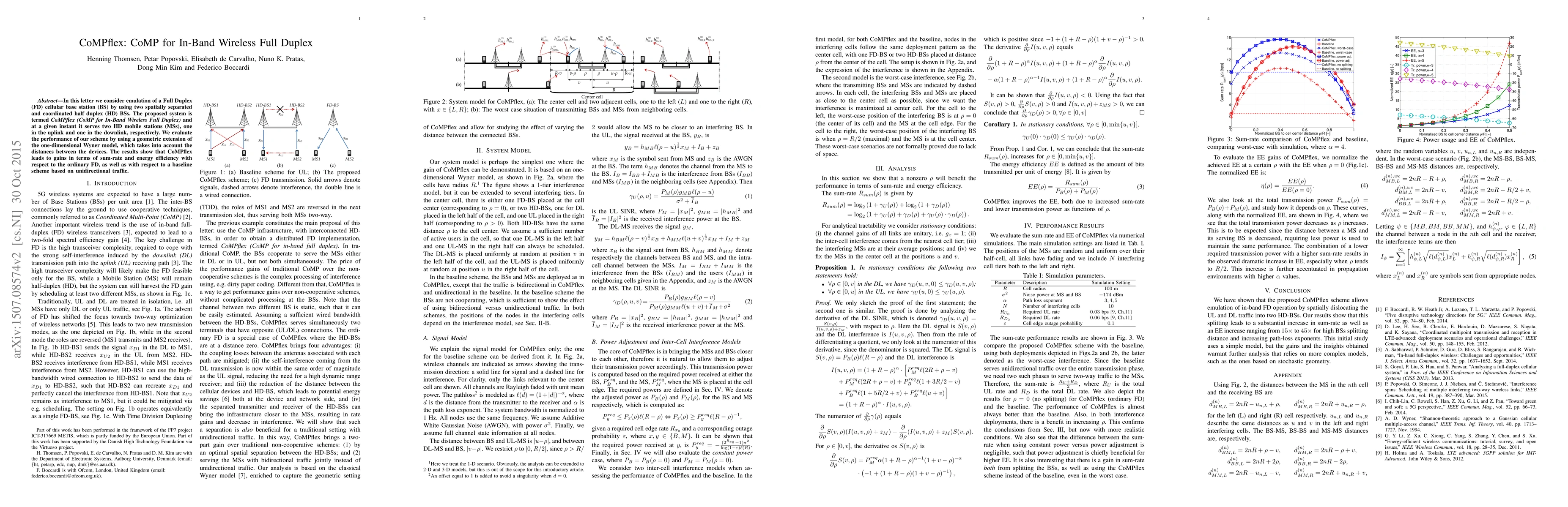 CoMPflex emulates a Full Duplex cellular base station using two coordinated half duplex base stations, achieving improved sum-rate and energy efficiency compared to traditional Full Duplex and unidirectional traffic baselines.