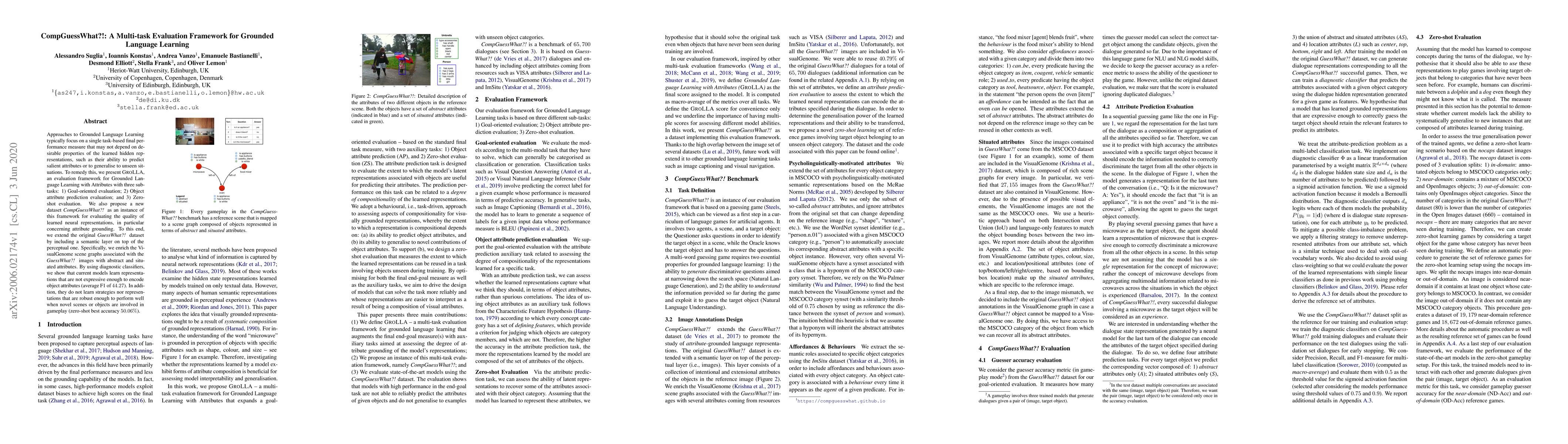 The paper introduces GROLLA, a multi-task evaluation framework for Grounded Language Learning with Attributes, comprising goal-oriented, object attribute prediction, and zero-shot evaluation sub-tasks. It also proposes a new dataset, CompGuessWhat?!, enriched with semantic attributes to assess the quality of learned neural representations and reveals that current models lack sufficient expressiveness and robustness for attribute grounding and zero-shot performance.