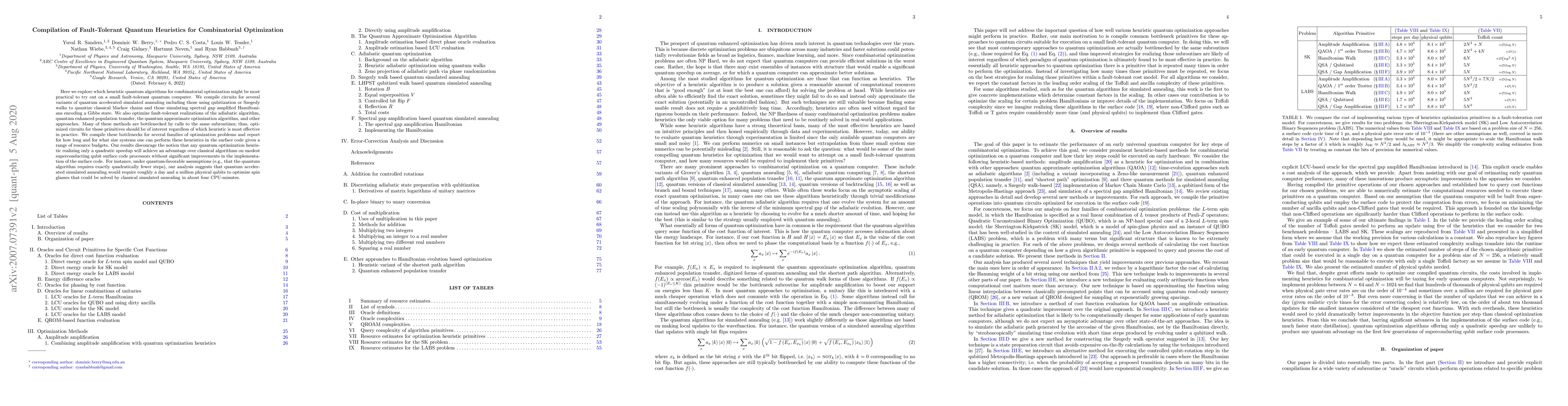 Here we explore which heuristic quantum algorithms for combinatorial optimization might be most practical to try out on a small fault-tolerant quantum computer. We compile circuits for several variants of quantum accelerated simulated annealing including those using qubitization or Szegedy walks to quantize classical Markov chains and those simulating spectral gap amplified Hamiltonians encoding a Gibbs state. We also optimize fault-tolerant realizations of the adiabatic algorithm, quantum enhanced population transfer, the quantum approximate optimization algorithm, and other approaches. Many of these methods are bottlenecked by calls to the same subroutines; thus, optimized circuits for those primitives should be of interest regardless of which heuristic is most effective in practice. We compile these bottlenecks for several families of optimization problems and report for how long and for what size systems one can perform these heuristics in the surface code given a range of resource budgets. Our results discourage the notion that any quantum optimization heuristic realizing only a quadratic speedup will achieve an advantage over classical algorithms on modest superconducting qubit surface code processors without significant improvements in the implementation of the surface code. For instance, under quantum-favorable assumptions (e.g., that the quantum algorithm requires exactly quadratically fewer steps), our analysis suggests that quantum accelerated simulated annealing would require roughly a day and a million physical qubits to optimize spin glasses that could be solved by classical simulated annealing in about four CPU-minutes.