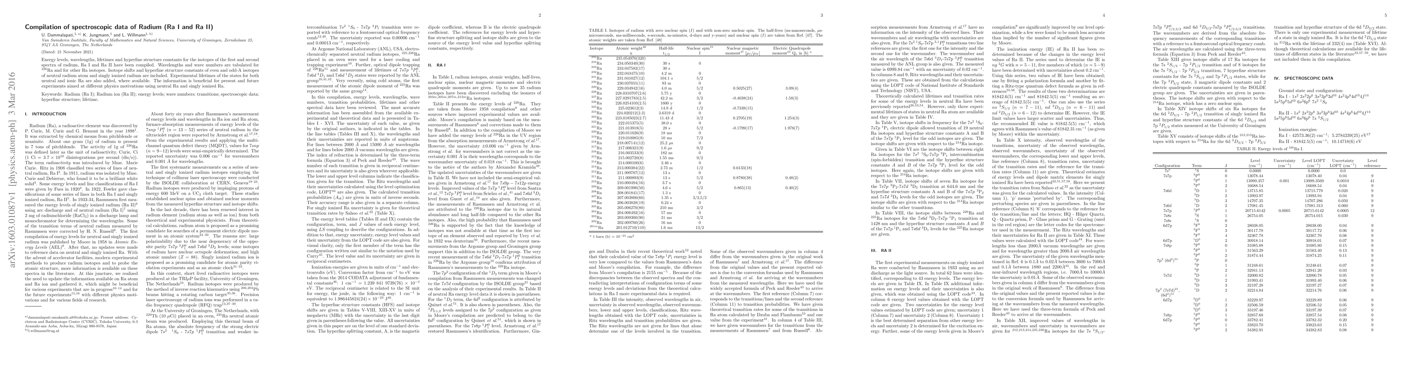 This paper compiles spectroscopic data for radium isotopes Ra I and Ra II, including energy levels, wavelengths, lifetimes, and hyperfine structure constants. The data is valuable for current and future experiments involving neutral and singly ionized radium for various physics applications.