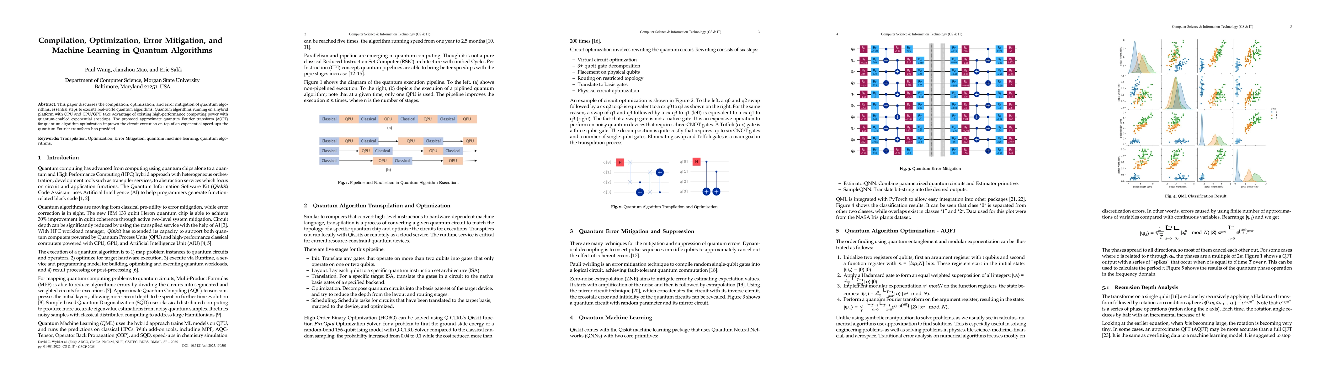This paper discusses the compilation, optimization, and error mitigation of quantum algorithms, essential steps to execute real-world quantum algorithms. Quantum algorithms running on a hybrid platform with QPU and CPU/GPU take advantage of existing high-performance computing power with quantum-enabled exponential speedups. The proposed approximate quantum Fourier transform (AQFT) for quantum algorithm optimization improves the circuit execution on top of an exponential speed-ups the quantum Fourier transform has provided.