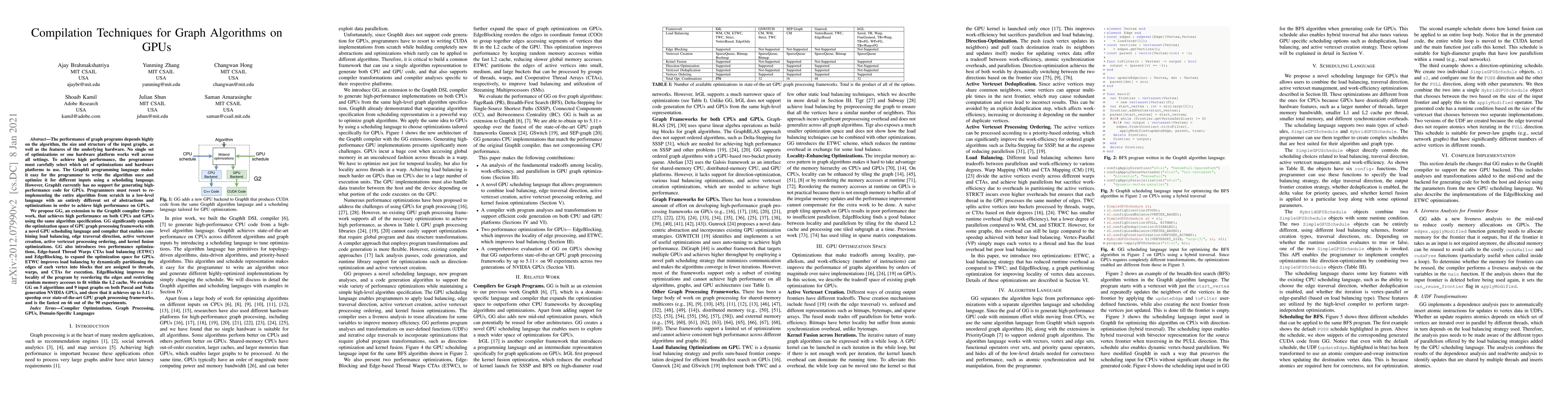 GG extends the GraphIt compiler to generate high-performance GPU code for graph algorithms, introducing novel scheduling and optimization techniques like ETWC and EdgeBlocking. It achieves up to 5.11x speedup over existing GPU frameworks on various algorithms and graphs.