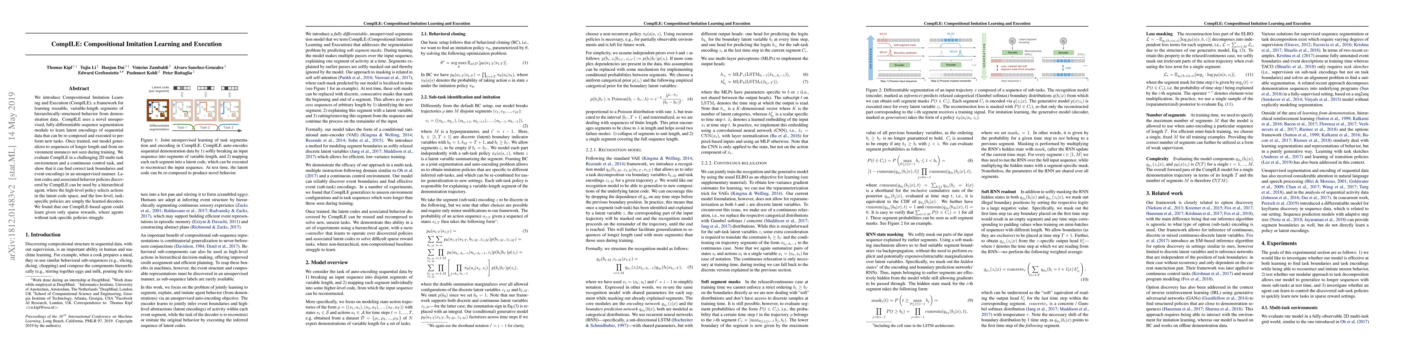 We introduce Compositional Imitation Learning and Execution (CompILE): a framework for learning reusable, variable-length segments of hierarchically-structured behavior from demonstration data. CompILE uses a novel unsupervised, fully-differentiable sequence segmentation module to learn latent encodings of sequential data that can be re-composed and executed to perform new tasks. Once trained, our model generalizes to sequences of longer length and from environment instances not seen during training. We evaluate CompILE in a challenging 2D multi-task environment and a continuous control task, and show that it can find correct task boundaries and event encodings in an unsupervised manner. Latent codes and associated behavior policies discovered by CompILE can be used by a hierarchical agent, where the high-level policy selects actions in the latent code space, and the low-level, task-specific policies are simply the learned decoders. We found that our CompILE-based agent could learn given only sparse rewards, where agents without task-specific policies struggle.