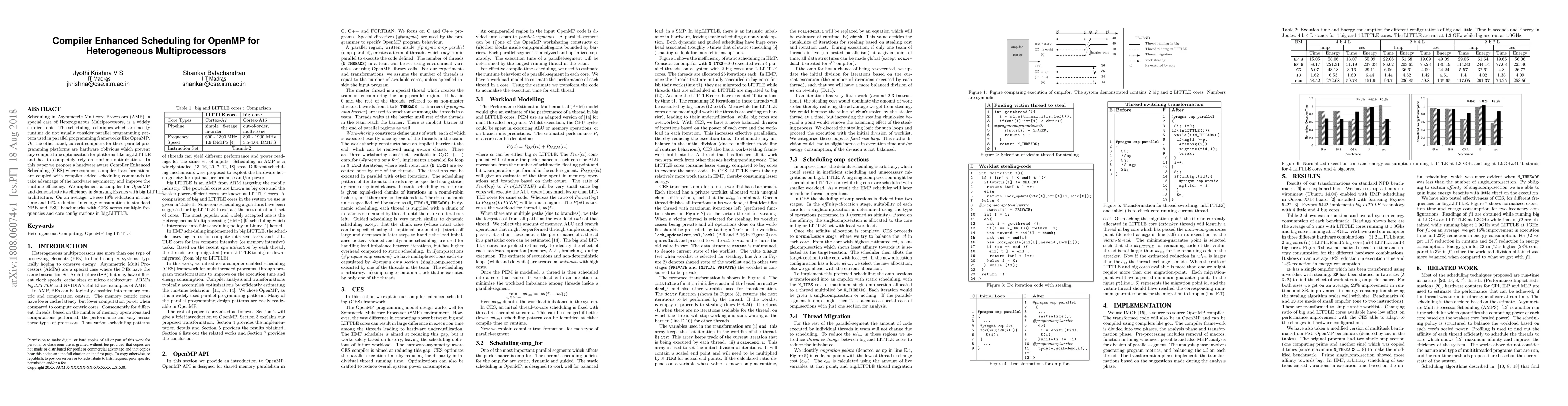 This paper proposes a hardware-aware Compiler Enhanced Scheduling (CES) technique to optimize scheduling for OpenMP on Heterogeneous Multiprocessors, specifically targeting big.LITTLE architectures. The CES approach combines compiler transformations with scheduling commands to leverage hardware asymmetry, resulting in an average 18% reduction in runtime and 14% reduction in energy consumption on Samsung Exynos processors.