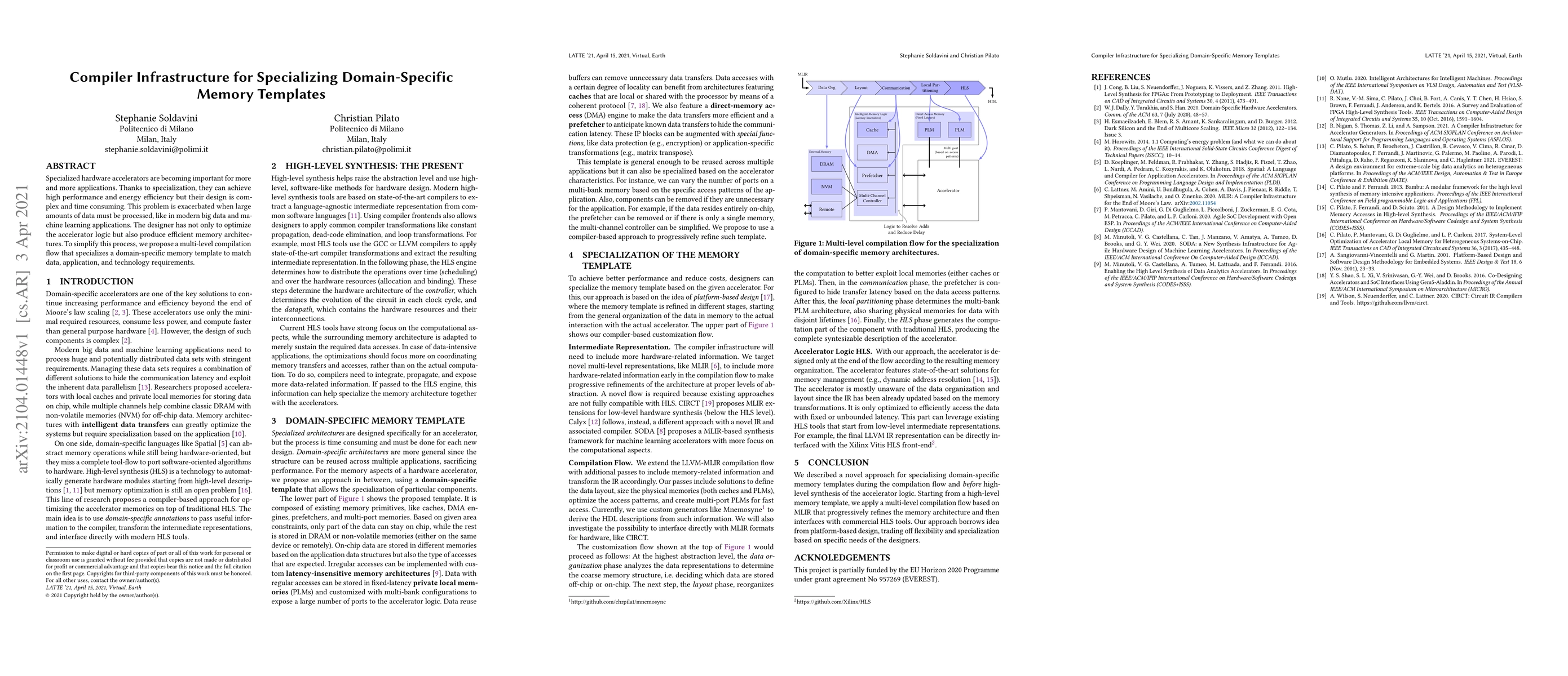 Specialized hardware accelerators are becoming important for more and more applications. Thanks to specialization, they can achieve high performance and energy efficiency but their design is complex and time consuming. This problem is exacerbated when large amounts of data must be processed, like in modern big data and machine learning applications. The designer has not only to optimize the accelerator logic but also produce efficient memory architectures. To simplify this process, we propose a multi-level compilation flow that specializes a domain-specific memory template to match data, application, and technology requirements.