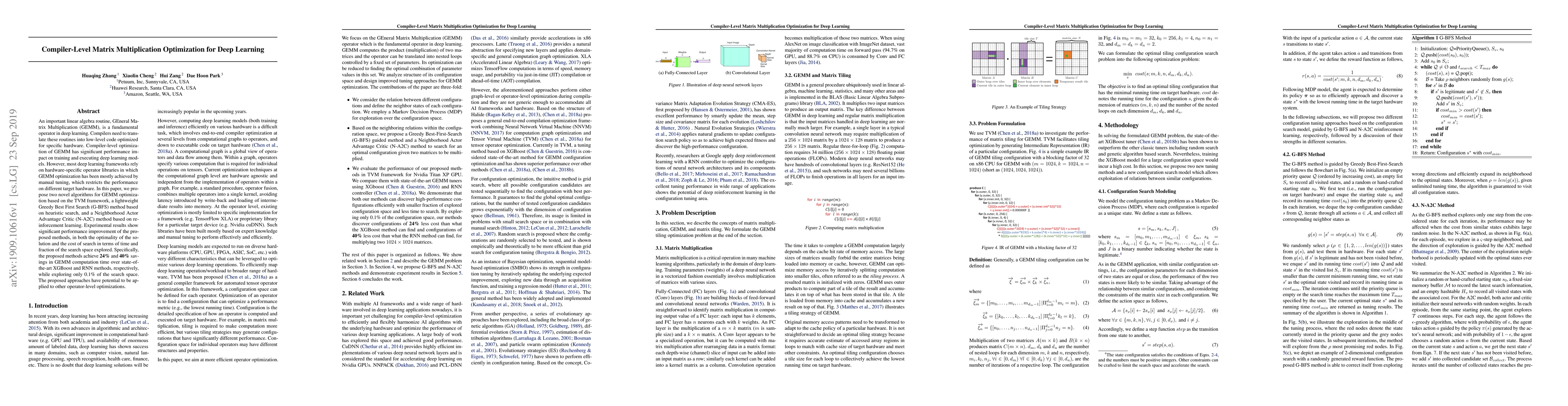An important linear algebra routine, GEneral Matrix Multiplication (GEMM), is a fundamental operator in deep learning. Compilers need to translate these routines into low-level code optimized for specific hardware. Compiler-level optimization of GEMM has significant performance impact on training and executing deep learning models. However, most deep learning frameworks rely on hardware-specific operator libraries in which GEMM optimization has been mostly achieved by manual tuning, which restricts the performance on different target hardware. In this paper, we propose two novel algorithms for GEMM optimization based on the TVM framework, a lightweight Greedy Best First Search (G-BFS) method based on heuristic search, and a Neighborhood Actor Advantage Critic (N-A2C) method based on reinforcement learning. Experimental results show significant performance improvement of the proposed methods, in both the optimality of the solution and the cost of search in terms of time and fraction of the search space explored. Specifically, the proposed methods achieve 24% and 40% savings in GEMM computation time over state-of-the-art XGBoost and RNN methods, respectively, while exploring only 0.1% of the search space. The proposed approaches have potential to be applied to other operator-level optimizations.