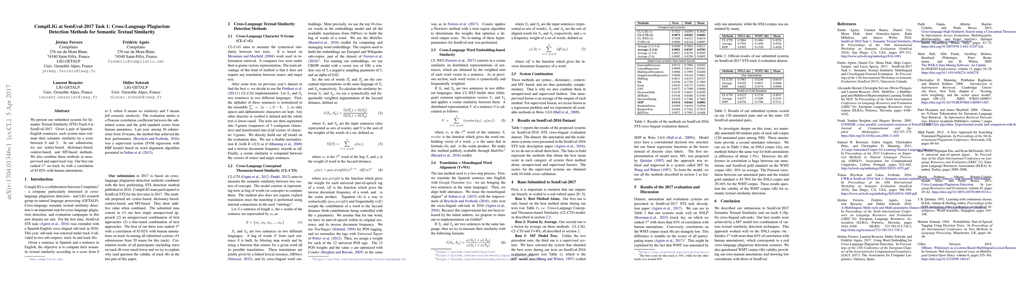 Summary: The paper describes the CompiLIG systems submitted for SemEval-2017 Task 1, focusing on cross-language plagiarism detection between Spanish and English sentences. The best performing model combines various methods, achieving first place with a high correlation of 83.02% to human annotations.