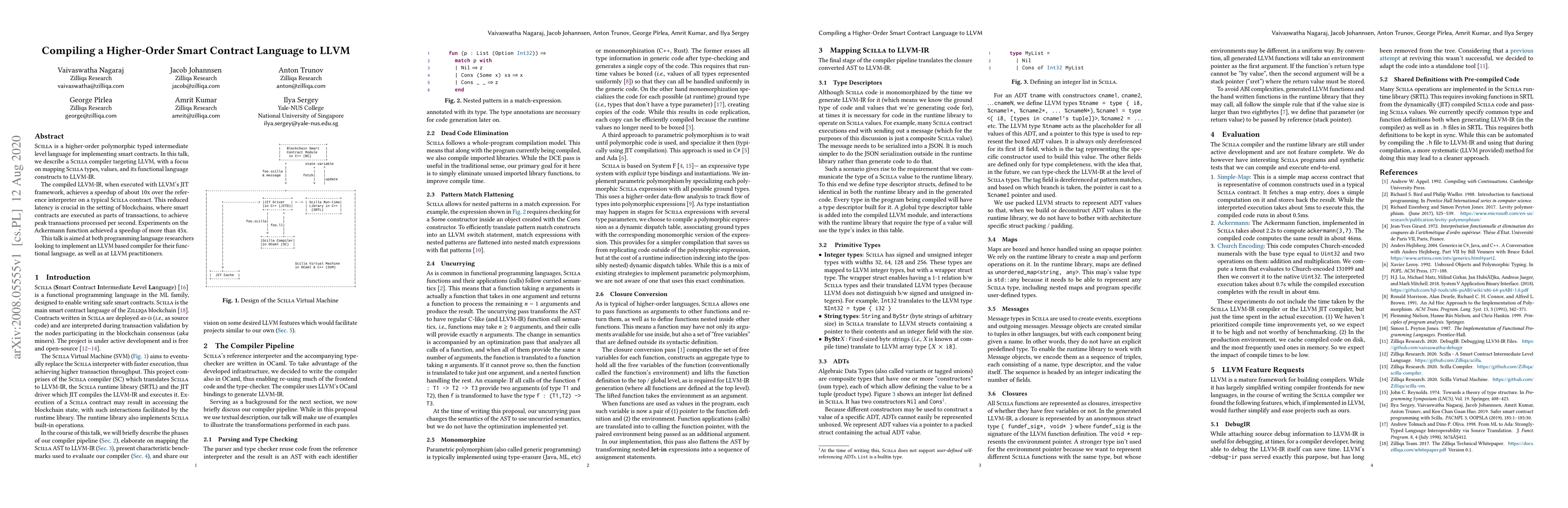 The paper presents a Scilla compiler targeting LLVM, detailing the translation of Scilla's functional constructs, higher-order functions, and algebraic data types to LLVM-IR, along with a performance evaluation demonstrating significant speed improvements.