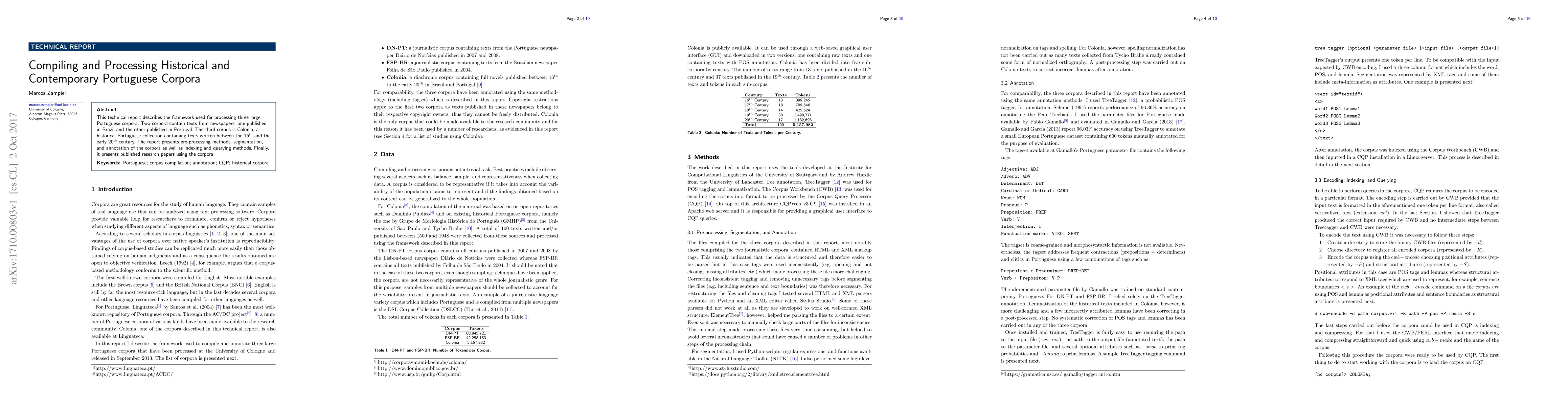 This technical report describes the framework used for processing three large Portuguese corpora. Two corpora contain texts from newspapers, one published in Brazil and the other published in Portugal. The third corpus is Colonia, a historical Portuguese collection containing texts written between the 16th and the early 20th century. The report presents pre-processing methods, segmentation, and annotation of the corpora as well as indexing and querying methods. Finally, it presents published research papers using the corpora.