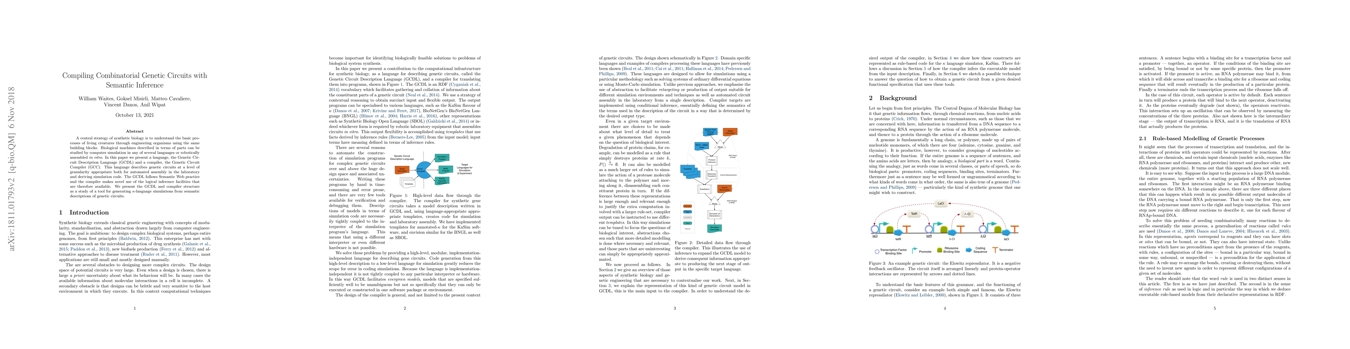 A central strategy of synthetic biology is to understand the basic processes of living creatures through engineering organisms using the same building blocks. Biological machines described in terms of parts can be studied by computer simulation in any of several languages or robotically assembled in vitro. In this paper we present a language, the Genetic Circuit Description Language (GCDL) and a compiler, the Genetic Circuit Compiler (GCC). This language describes genetic circuits at a level of granularity appropriate both for automated assembly in the laboratory and deriving simulation code. The GCDL follows Semantic Web practice and the compiler makes novel use of the logical inference facilities that are therefore available. We present the GCDL and compiler structure as a study of a tool for generating $\kappa$-language simulations from semantic descriptions of genetic circuits.