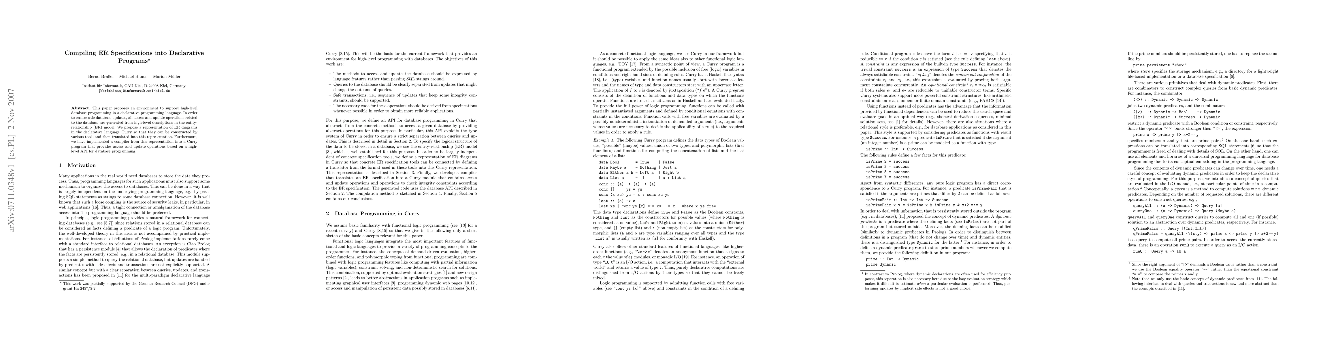 This paper introduces an environment for high-level database programming using a declarative language, translating ER model descriptions into Curry programs to ensure safe database operations. A compiler is implemented to convert the ER specifications into a high-level API for database access and updates.
