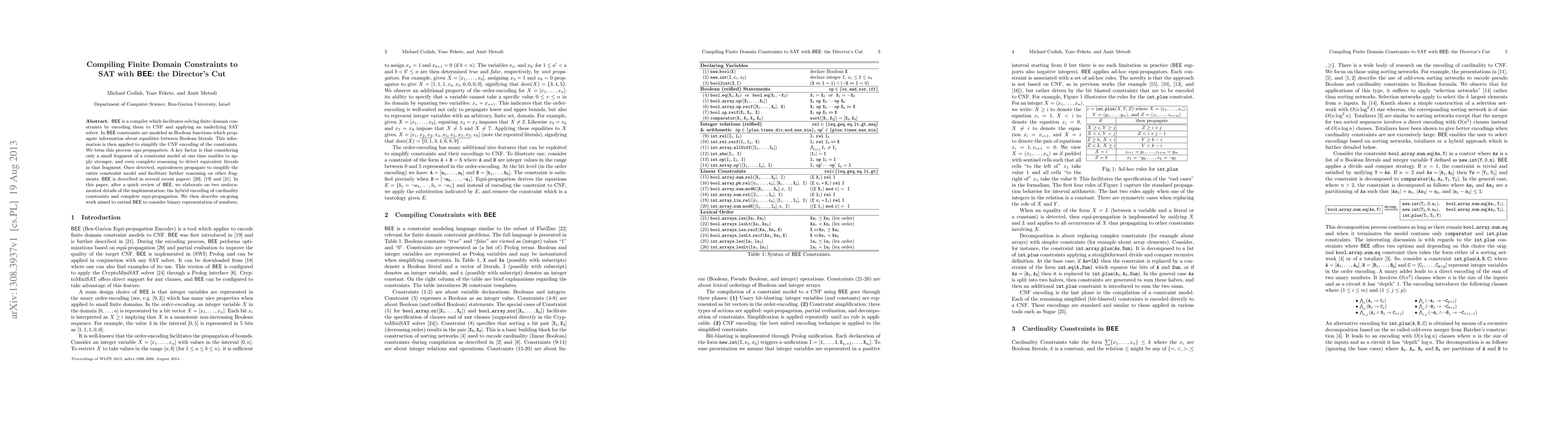 This paper elaborates on the BEE compiler's approach to solving finite domain constraints by encoding them into CNF and utilizing SAT solvers, highlighting equi-propagation to simplify constraints. It focuses on undocumented details like hybrid cardinality constraints encoding and complete equi-propagation, and discusses ongoing work to extend BEE for binary number representation.
