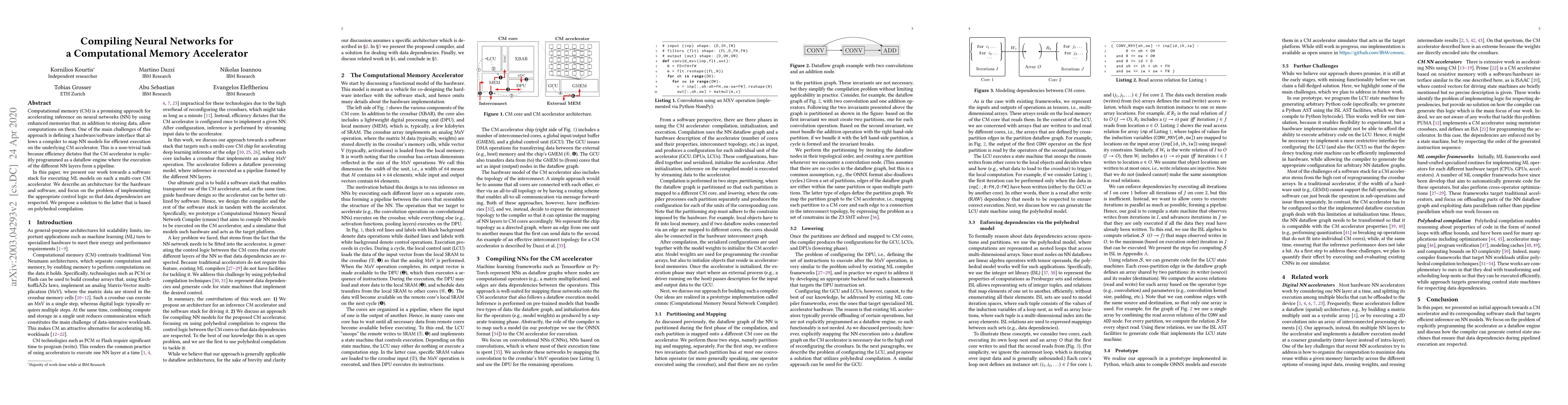 Computational memory (CM) is a promising approach for accelerating inference on neural networks (NN) by using enhanced memories that, in addition to storing data, allow computations on them. One of the main challenges of this approach is defining a hardware/software interface that allows a compiler to map NN models for efficient execution on the underlying CM accelerator. This is a non-trivial task because efficiency dictates that the CM accelerator is explicitly programmed as a dataflow engine where the execution of the different NN layers form a pipeline. In this paper, we present our work towards a software stack for executing ML models on such a multi-core CM accelerator. We describe an architecture for the hardware and software, and focus on the problem of implementing the appropriate control logic so that data dependencies are respected. We propose a solution to the latter that is based on polyhedral compilation.
