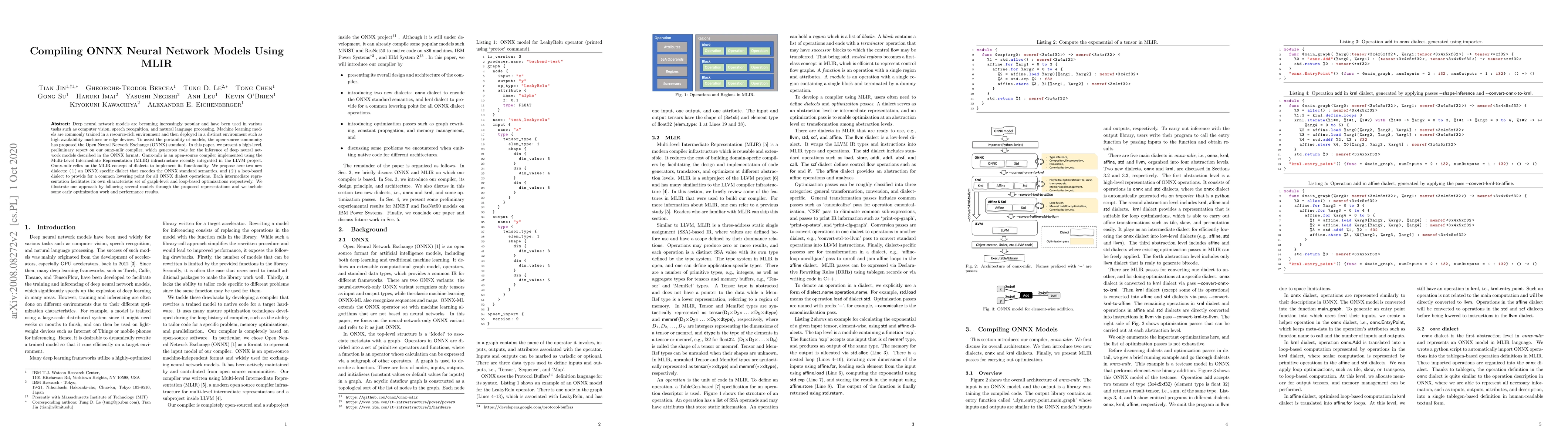 This paper introduces onnx-mlir, an open-source compiler that uses the MLIR infrastructure to convert ONNX neural network models into executable code for inference, employing two new MLIR dialects for ONNX semantics and loop optimizations. Early performance results and optimizations are presented.