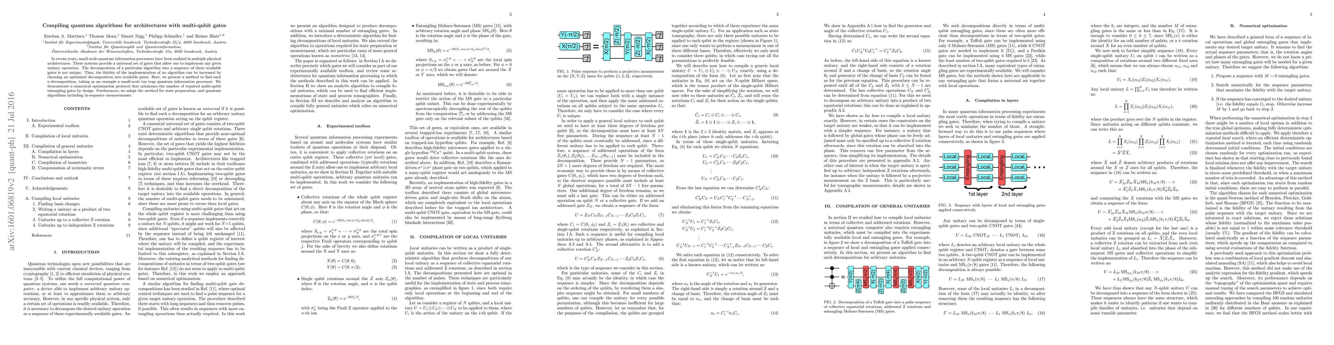 Quantum algorithms require a universal set of gates that can be implemented in a physical system. For these, an optimal decomposition into a sequence of available operations is desired. Here, we present a method to find such sequences for a small-scale ion trap quantum information processor. We further adapt the method to state preparation and quantum algorithms with in-sequence measurements.