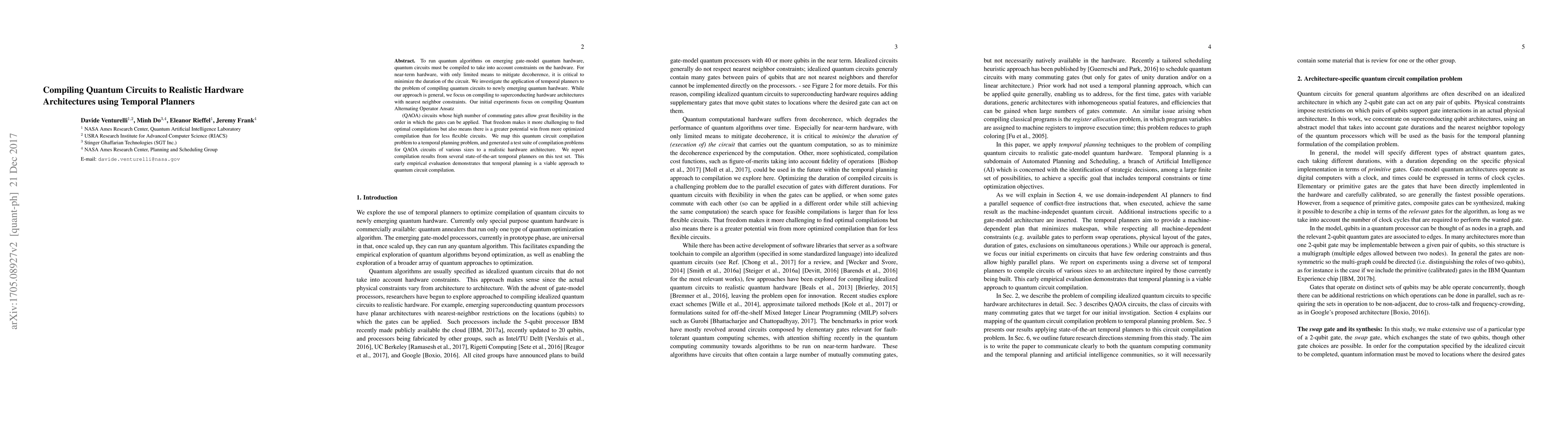To run quantum algorithms on emerging gate-model quantum hardware, quantum circuits must be compiled to take into account constraints on the hardware. For near-term hardware, with only limited means to mitigate decoherence, it is critical to minimize the duration of the circuit. We investigate the application of temporal planners to the problem of compiling quantum circuits to newly emerging quantum hardware. While our approach is general, we focus on compiling to superconducting hardware architectures with nearest neighbor constraints. Our initial experiments focus on compiling Quantum Alternating Operator Ansatz (QAOA) circuits whose high number of commuting gates allow great flexibility in the order in which the gates can be applied. That freedom makes it more challenging to find optimal compilations but also means there is a greater potential win from more optimized compilation than for less flexible circuits. We map this quantum circuit compilation problem to a temporal planning problem, and generated a test suite of compilation problems for QAOA circuits of various sizes to a realistic hardware architecture. We report compilation results from several state-of-the-art temporal planners on this test set. This early empirical evaluation demonstrates that temporal planning is a viable approach to quantum circuit compilation.