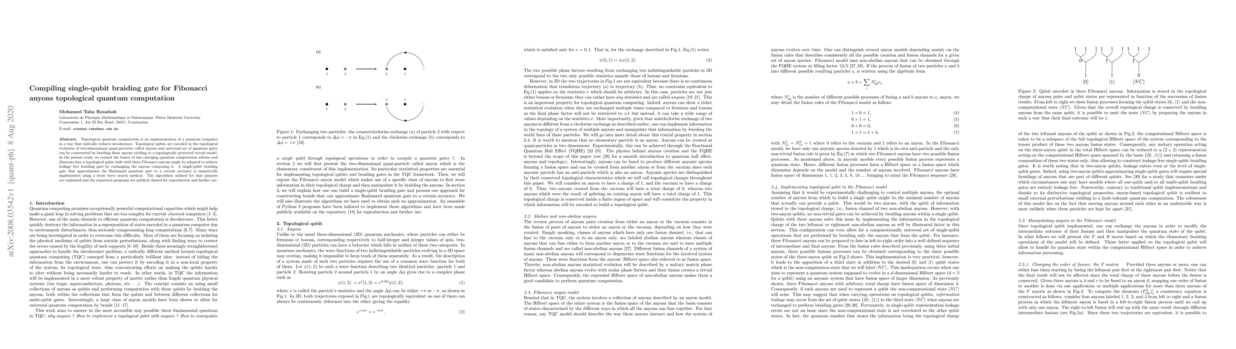 This paper explores topological quantum computation using Fibonacci anyons, detailing the construction of a single-qubit braiding gate through anyon exchange. A numerically implemented approximation of the Hadamard gate is achieved, with algorithms and programs shared for reproducibility.