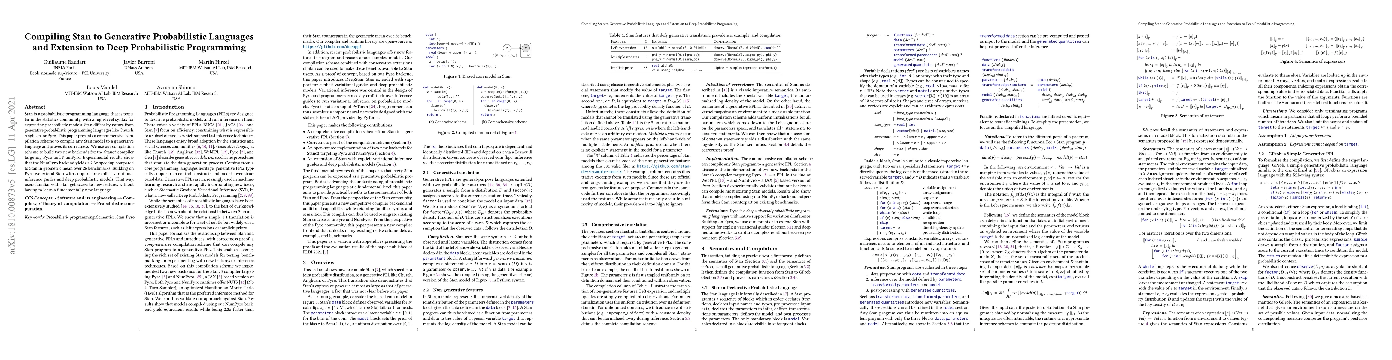 This paper details a compilation scheme to convert Stan models into generative probabilistic languages, specifically Pyro and NumPyro, achieving a 2.3x speedup on average. It extends Stan with deep probabilistic programming and variational inference capabilities, allowing users to leverage new features without switching languages.