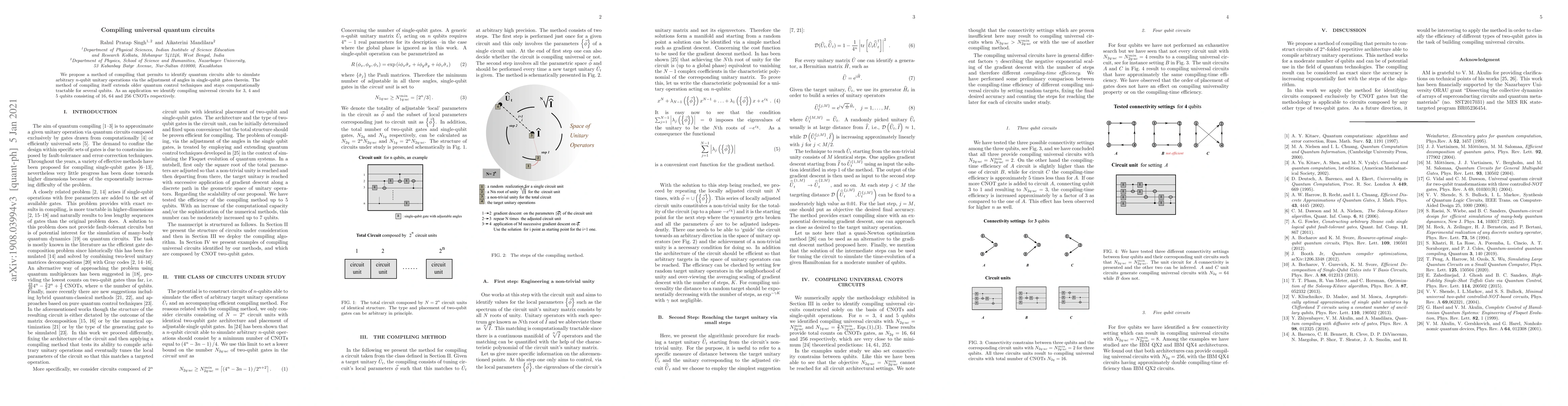 We propose a method of compiling that permits to identify quantum circuits able to simulate arbitrary $n$-qubit unitary operations via the adjustment of angles in single-qubit gates therein. The method of compiling itself extends older quantum control techniques and stays computationally tractable for several qubits. As an application we identify compiling universal circuits for $3$, $4$ and $5$ qubits consisting of $16$, $64$ and $ 256$ CNOTs respectively.