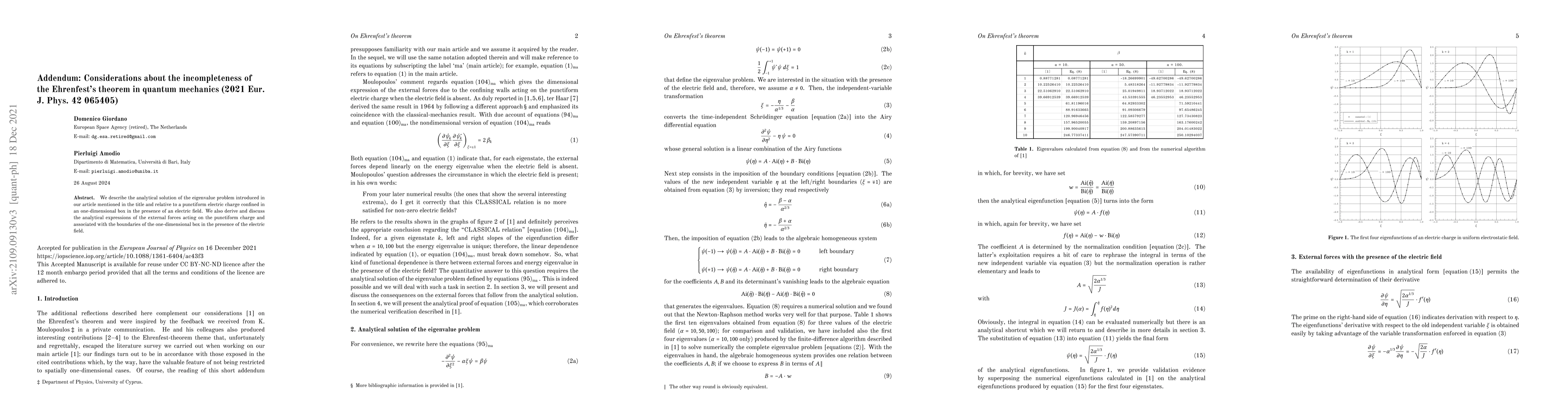 We describe the analytical solution of the eigenvalue problem introduced in our article mentioned in the title and relative to a punctiform electric charge confined in an one-dimensional box in the presence of an electric field. We also derive and discuss the analytical expressions of the external forces acting on the punctiform charge and associated with the boundaries of the one-dimensional box in the presence of the electric field.