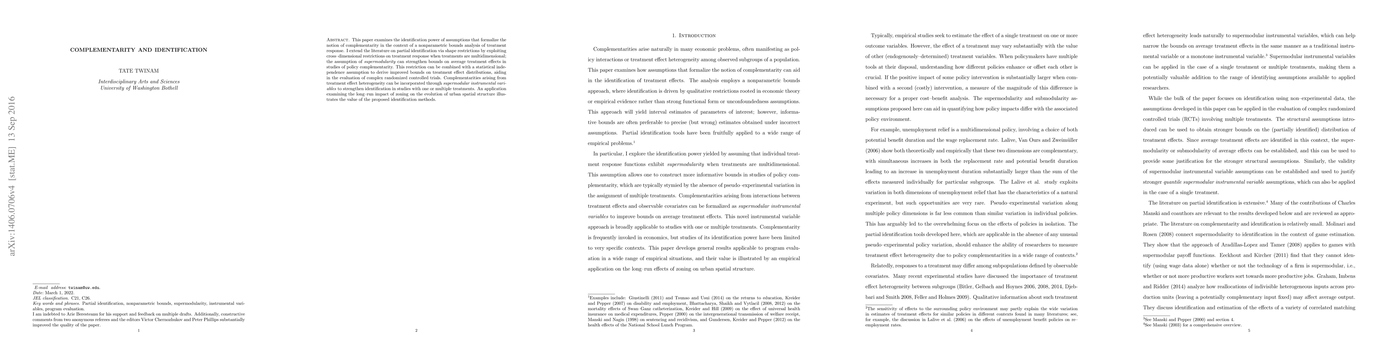 This paper examines the identification power of assumptions that formalize the notion of complementarity in the context of a nonparametric bounds analysis of treatment response. I extend the literature on partial identification via shape restrictions by exploiting cross-dimensional restrictions on treatment response when treatments are multidimensional; the assumption of supermodularity can strengthen bounds on average treatment effects in studies of policy complementarity. This restriction can be combined with a statistical independence assumption to derive improved bounds on treatment effect distributions, aiding in the evaluation of complex randomized controlled trials. Complementarities arising from treatment effect heterogeneity can be incorporated through supermodular instrumental variables to strengthen identification in studies with one or multiple treatments. An application examining the long-run impact of zoning on the evolution of urban spatial structure illustrates the value of the proposed identification methods.