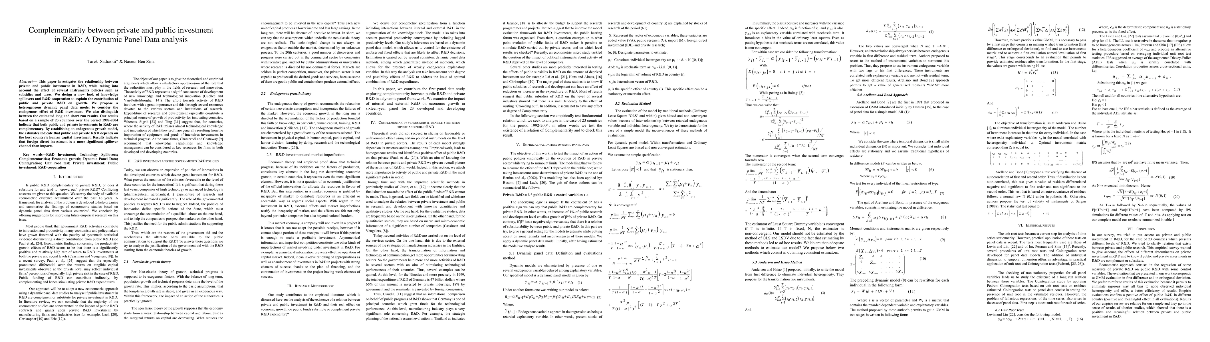 This paper uses a dynamic panel data model to analyze the complementarity between private and public R&D investments, finding both are mutually beneficial. The study highlights that public and private R&D investments are influenced by the host country's human capital and that foreign direct investment acts as a more significant knowledge spillover than imports.