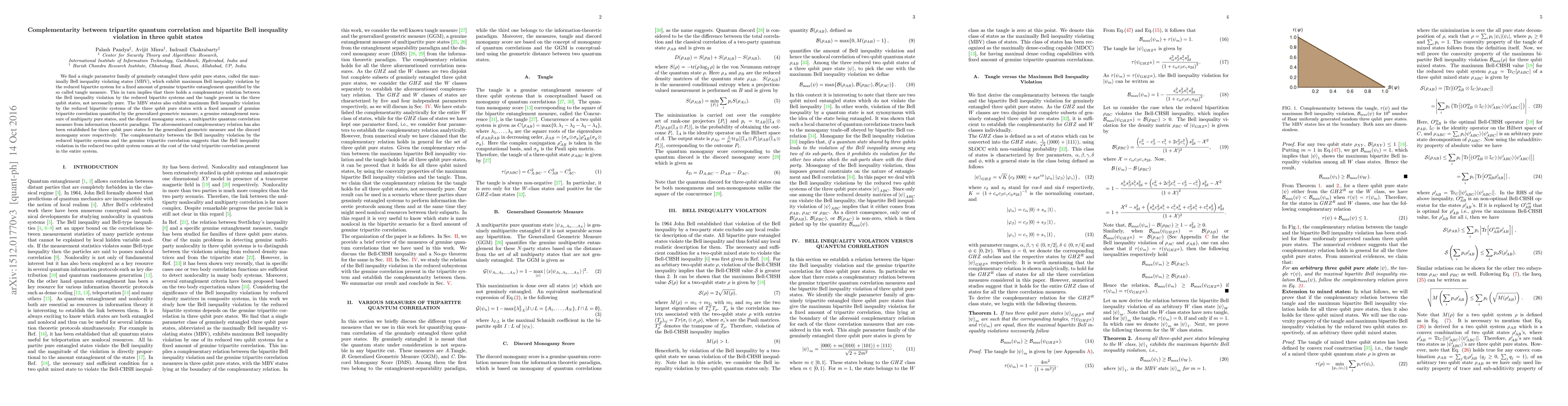 We find a single parameter family of genuinely entangled three qubit pure states, called the maximally Bell inequality violating states (MBV), which exhibit maximum Bell inequality violation by the reduced bipartite system for a fixed amount of genuine tripartite entanglement quantified by the so called tangle measure. This in turn implies that there holds a complementary relation between the Bell inequality violation by the reduced bipartite systems and the tangle present in the three qubit states, not necessarily pure. The MBV states also exhibit maximum Bell inequality violation by the reduced bipartite systems of the three qubit pure states with a fixed amount of genuine tripartite correlation quantified by the generalized geometric measure, a genuine entanglement measure of multiparty pure states, and the discord monogamy score, a multipartite quantum correlation measure from information theoretic paradigm. The aforementioned complementary relation has also been established for three qubit pure states for the generalized geometric measure and the discord monogamy score respectively. The complementarity between the Bell inequality violation by the reduced bipartite systems and the genuine tripartite correlation suggests that the Bell inequality violation in the reduced two qubit system comes at the cost of the total tripartite correlation present in the entire system.