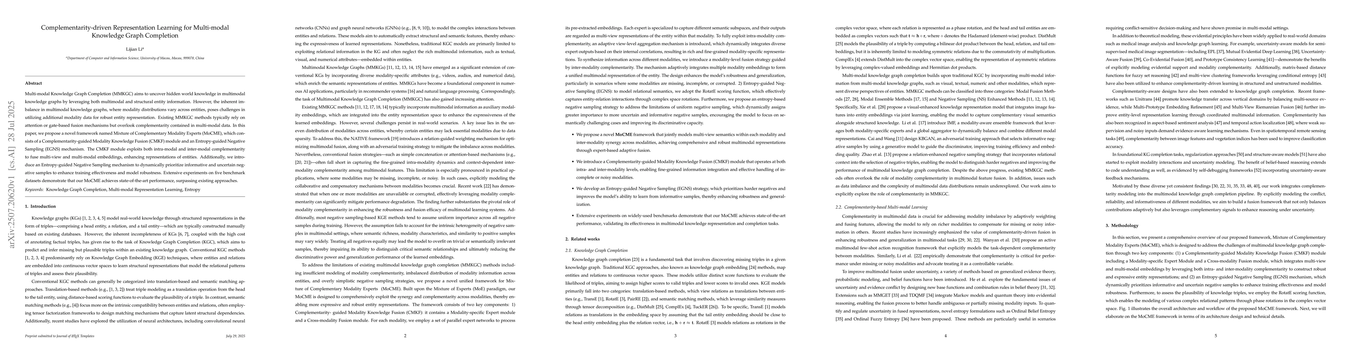 Multi-modal Knowledge Graph Completion (MMKGC) aims to uncover hidden world knowledge in multimodal knowledge graphs by leveraging both multimodal and structural entity information. However, the inherent imbalance in multimodal knowledge graphs, where modality distributions vary across entities, poses challenges in utilizing additional modality data for robust entity representation. Existing MMKGC methods typically rely on attention or gate-based fusion mechanisms but overlook complementarity contained in multi-modal data. In this paper, we propose a novel framework named Mixture of Complementary Modality Experts (MoCME), which consists of a Complementarity-guided Modality Knowledge Fusion (CMKF) module and an Entropy-guided Negative Sampling (EGNS) mechanism. The CMKF module exploits both intra-modal and inter-modal complementarity to fuse multi-view and multi-modal embeddings, enhancing representations of entities. Additionally, we introduce an Entropy-guided Negative Sampling mechanism to dynamically prioritize informative and uncertain negative samples to enhance training effectiveness and model robustness. Extensive experiments on five benchmark datasets demonstrate that our MoCME achieves state-of-the-art performance, surpassing existing approaches.