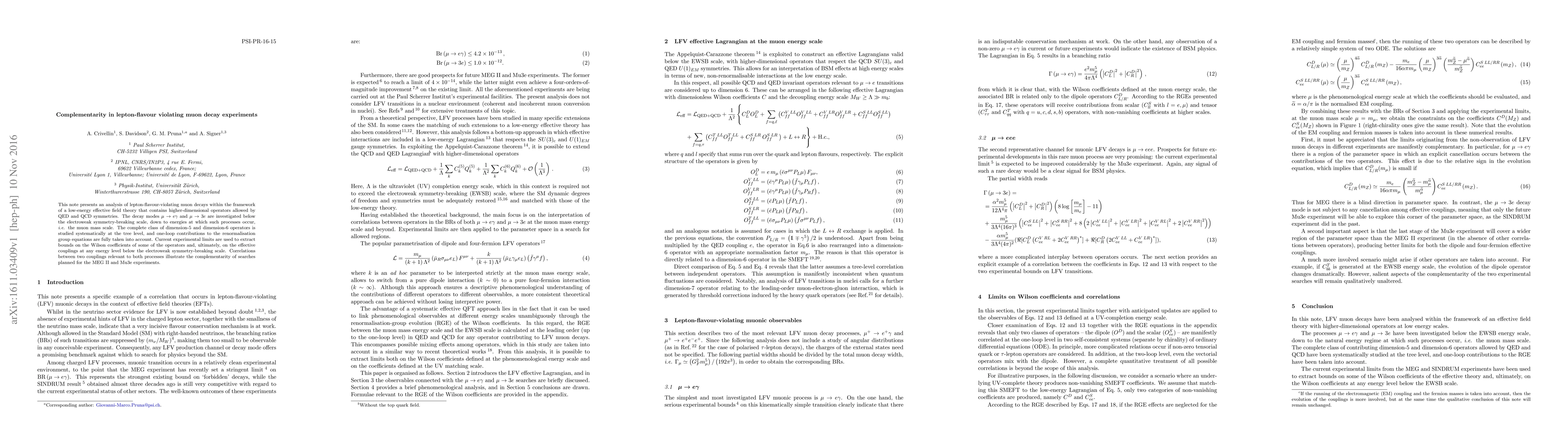 This note presents an analysis of lepton-flavour-violating muon decays within the framework of a low-energy effective field theory that contains higher-dimensional operators allowed by QED and QCD symmetries. The decay modes $\mu\to e \gamma$ and $\mu\to 3e$ are investigated below the electroweak symmetry-breaking scale, down to energies at which such processes occur, i.e. the muon mass scale. The complete class of dimension-5 and dimension-6 operators is studied systematically at the tree level, and one-loop contributions to the renormalisation group equations are fully taken into account. Current experimental limits are used to extract bounds on the Wilson coefficients of some of the operators and, ultimately, on the effective couplings at any energy level below the electroweak symmetry-breaking scale. Correlations between two couplings relevant to both processes illustrate the complementarity of searches planned for the MEG II and Mu3e experiments.