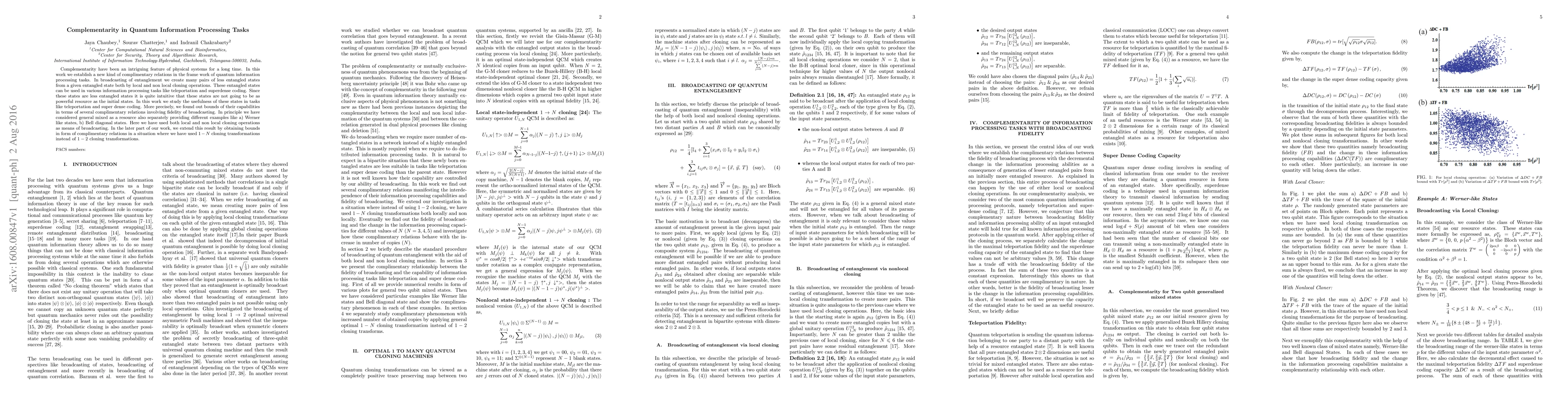 Complementarity have been an intriguing feature of physical systems for a long time. In this work we establish a new kind of complimentary relations in the frame work of quantum information processing tasks. In broadcasting of entanglement we create many pairs of less entangled states from a given entangled state both by local and non local cloning operations. These entangled states can be used in various information processing tasks like teleportation and superdense coding. Since these states are less entangled states it is quite intuitive that these states are not going to be as powerful resource as the initial states. In this work we study the usefulness of these states in tasks like teleportation and super dense coding. More precisely, we found out bounds of their capabilities in terms of several complimentary relations involving fidelity of broadcasting. In principle we have considered general mixed as a resource also separately providing different examples like a) Werner like states, b) Bell diagonal states. Here we have used both local and non local cloning operations as means of broadcasting. In the later part of our work, we extend this result by obtaining bounds in form of complimentary relations in a situation where we have used $1-N$ cloning transformations instead of $1-2$ cloning transformations.