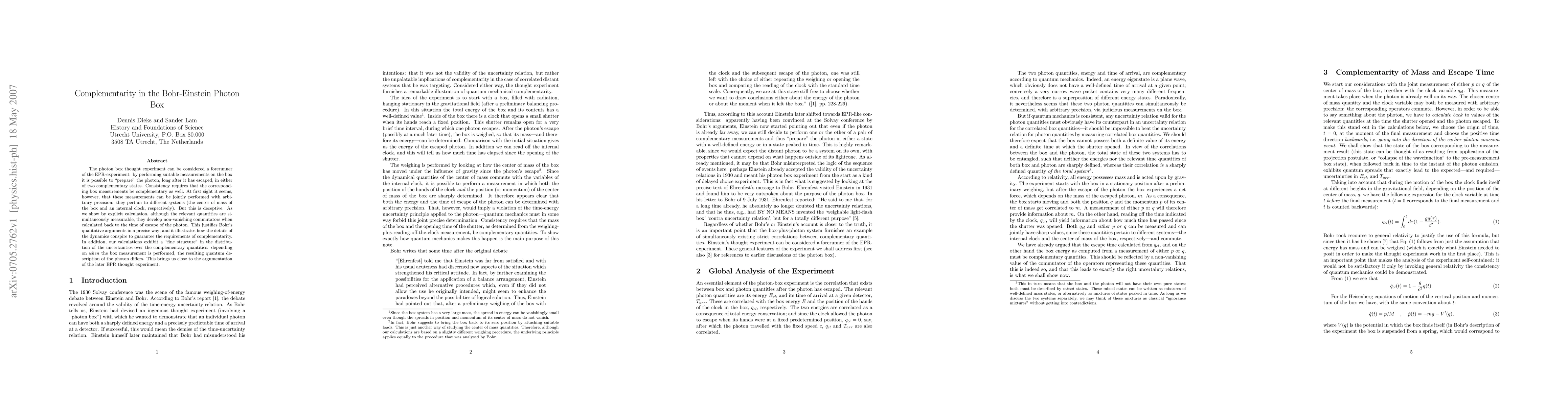The paper explores the Bohr-Einstein photon box thought experiment, demonstrating that measurements on the box, though seemingly simultaneous, develop non-vanishing commutators when traced back to the photon's escape time, thus justifying Bohr's complementarity arguments and revealing a "fine structure" in the uncertainties of complementary quantities.