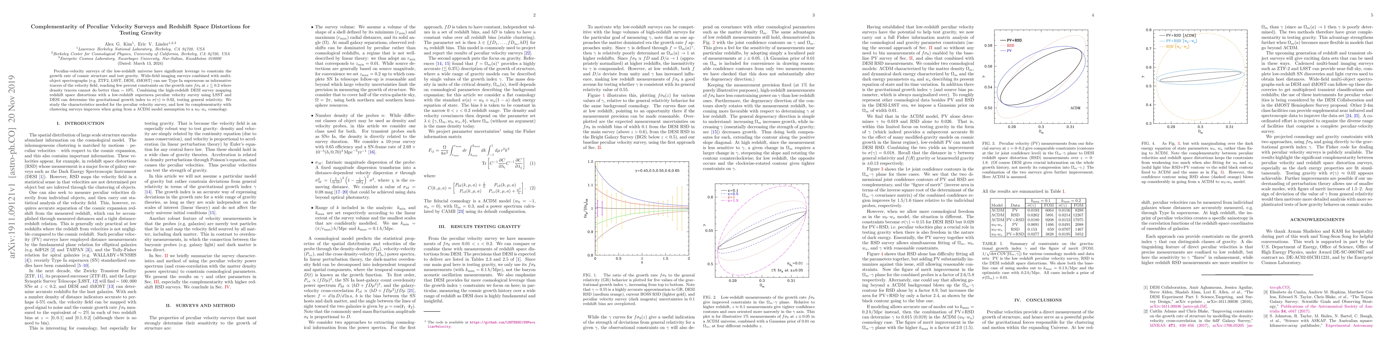 Peculiar-velocity surveys of the low-redshift universe have significant leverage to constrain the growth rate of cosmic structure and test gravity. Wide-field imaging surveys combined with multi-object spectrographs (e.g. ZTF2, LSST, DESI, 4MOST) can use Type Ia supernovae as informative tracers of the velocity field, reaching few percent constraints on the growth rate $f\sigma_8$ at $z\lesssim0.2$ where density tracers cannot do better than $\sim10\%$. Combining the high-redshift DESI survey mapping redshift space distortions with a low-redshift supernova peculiar velocity survey using LSST and DESI can determine the gravitational growth index to $\sigma(\gamma)\approx0.02$, testing general relativity. We study the characteristics needed for the peculiar velocity survey, and how its complementarity with clustering surveys improves when going from a $\Lambda$CDM model assumption to a $w_0$-$w_a$ cosmology.