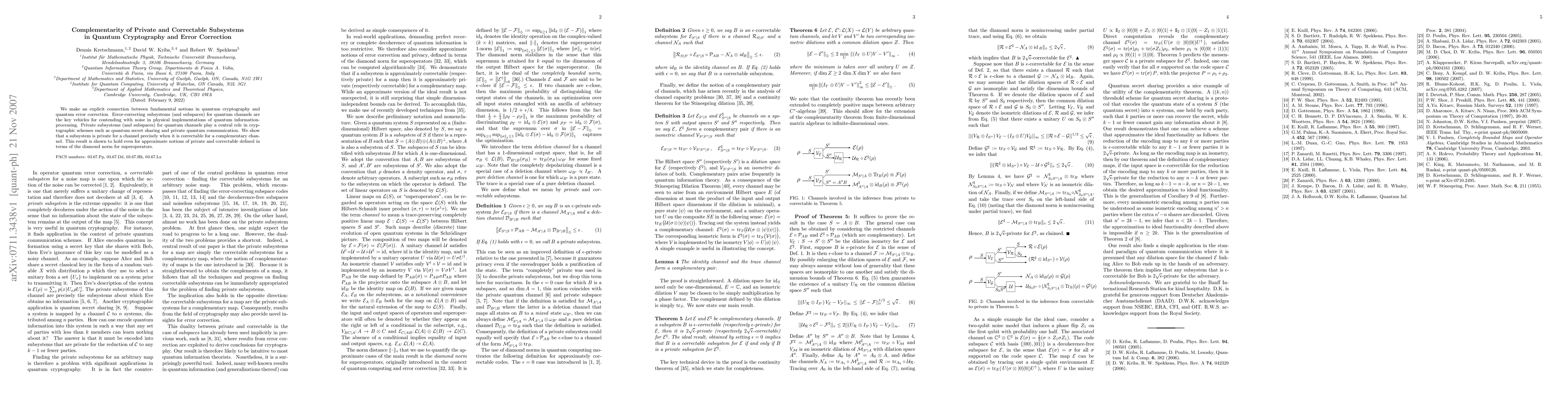 This paper establishes a connection between private subsystems in quantum cryptography and correctable subsystems in quantum error correction, demonstrating that a subsystem is private if it is correctable for a complementary channel, even under approximate definitions using the diamond norm.
