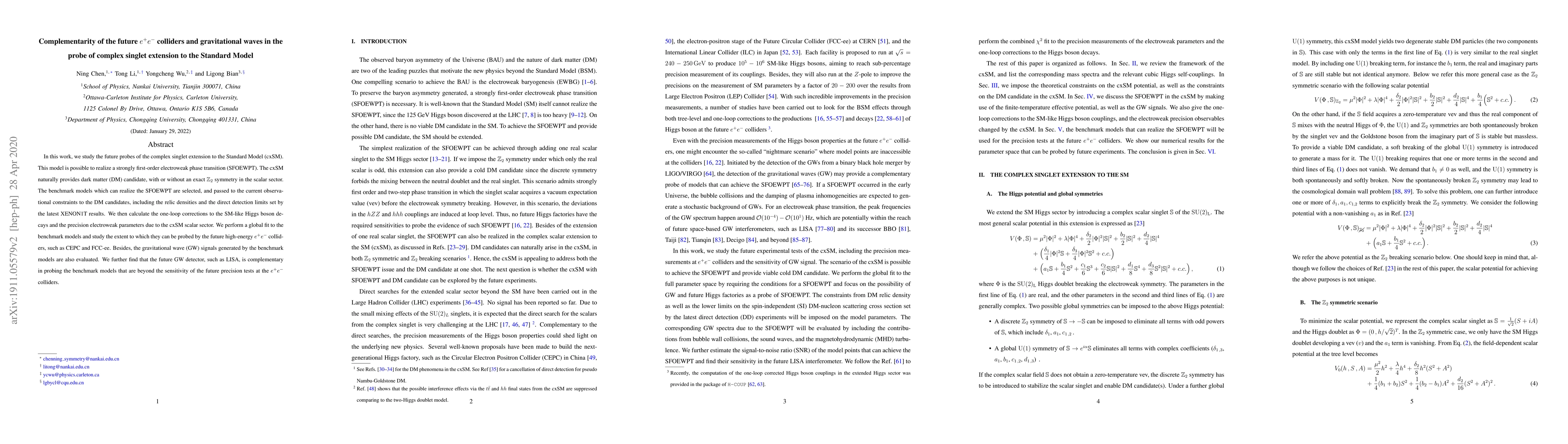 Future e+e- colliders like CEPC and FCC-ee will be able to probe complex singlet extension models that predict dark matter candidates, while gravitational wave detectors like LISA can provide complementary information beyond their sensitivity.