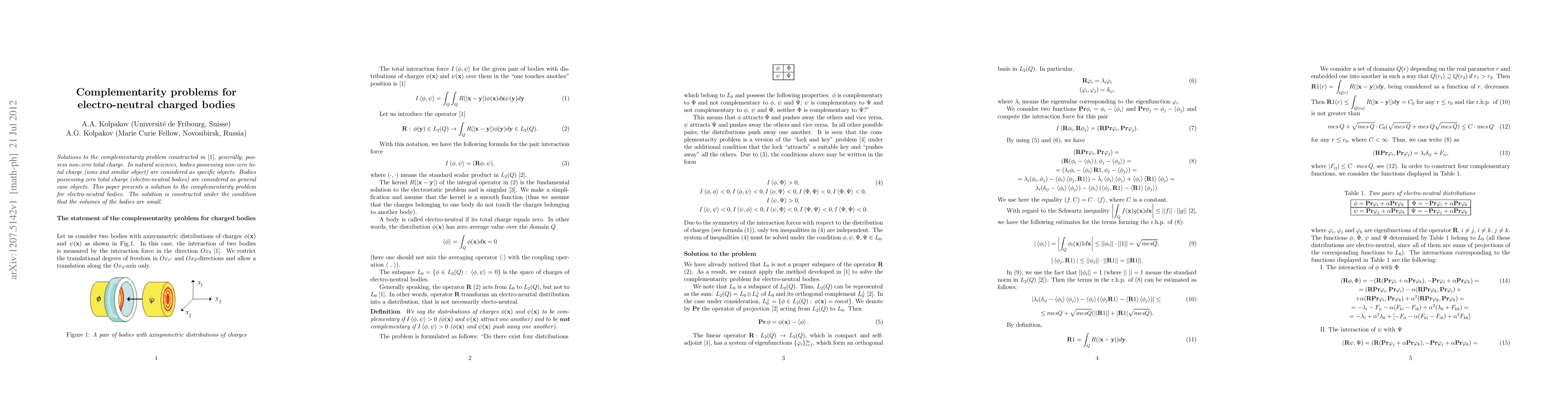 This research is important because it provides a solution to the complementarity problem for electro-neutral charged bodies.