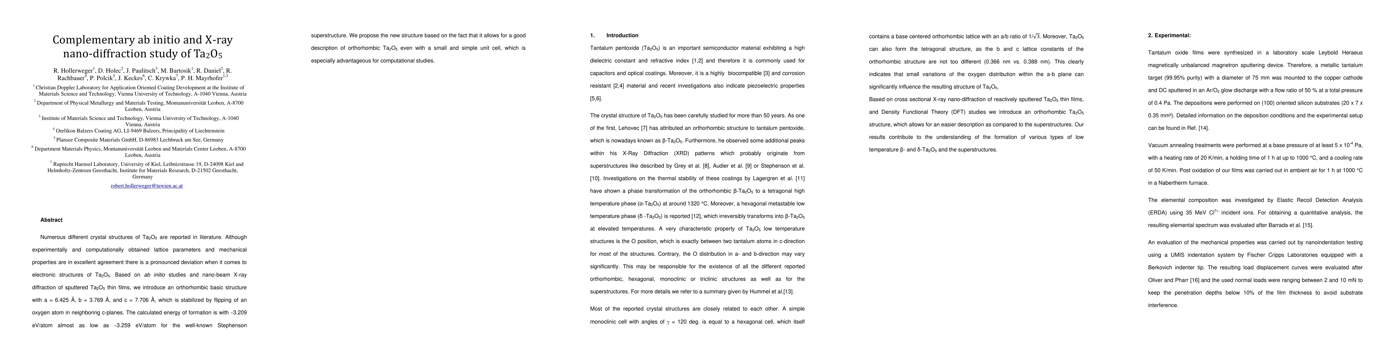 This study combines ab initio calculations and X-ray nano-diffraction to propose a new orthorhombic structure for Ta2O5 with lattice parameters a = 0.6425, b = 0.3769, and c = 0.7706 nm, stabilized by an oxygen atom flip, offering a competitive energy of formation and a simpler computational model compared to the Stephenson superstructure.