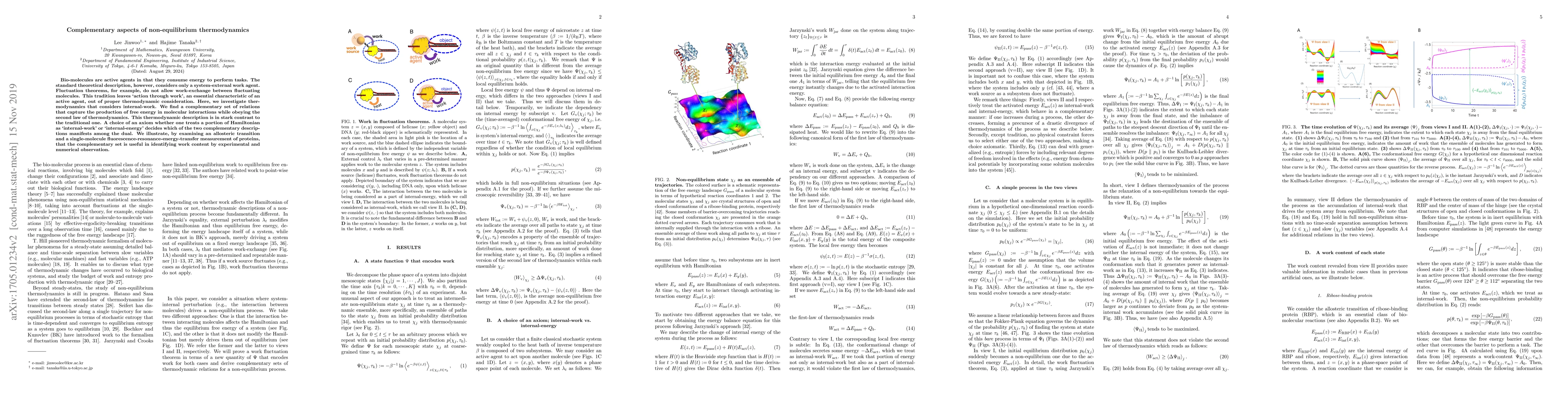Bio-molecules are active agents in that they consume energy to perform tasks. The standard theoretical description, however, considers only a system-external work agent. Fluctuation theorems, for example, do not allow work-exchange between fluctuating molecules. This tradition leaves `action through work', an essential characteristic of an active agent, out of proper thermodynamic consideration. Here, we investigate thermodynamics that considers internal-work. We find a complementary set of relations that capture the production of free energy in molecular interactions while obeying the second law of thermodynamics. This thermodynamic description is in stark contrast to the traditional one. A choice of an axiom whether one treats a portion of Hamiltonian as `internal-work' or `internal-energy' decides which of the two complementary descriptions manifests among the dual. We illustrate, by examining an allosteric transition and a single-molecule fluorescence-resonance-energy-transfer measurement of proteins, that the complementary set is useful in identifying work content by experimental and numerical observation.