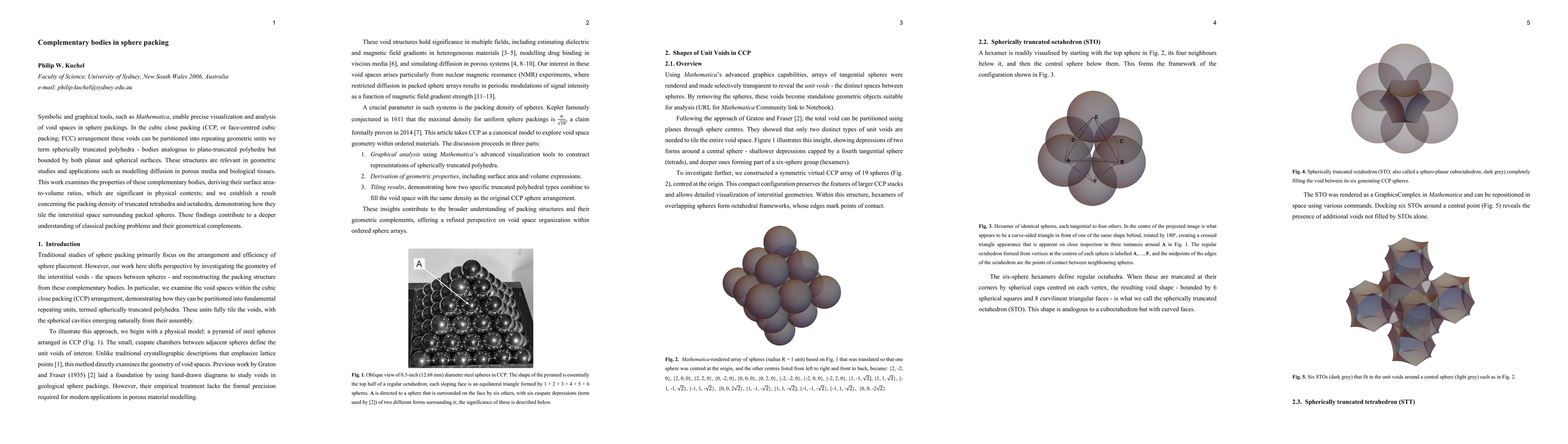 Symbolic and graphical tools, such as Mathematica, enable precise visualization and analysis of void spaces in sphere packings. In the cubic close packing (CCP, or face-centred cubic packing; FCC) arrangement these voids can be partitioned into repeating geometric units we term spherically truncated polyhedra - bodies analogous to plane-truncated polyhedra but bounded by both planar and spherical surfaces. These structures are relevant in geometric studies and applications such as modelling diffusion in porous media and biological tissues. This work examines the properties of these complementary bodies, deriving their surface area-to-volume ratios, which are significant in physical contexts; and we establish a result concerning the packing density of truncated tetrahedra and octahedra, demonstrating how they tile the interstitial space surrounding packed spheres. These findings contribute to a deeper understanding of classical packing problems and their geometrical complements.